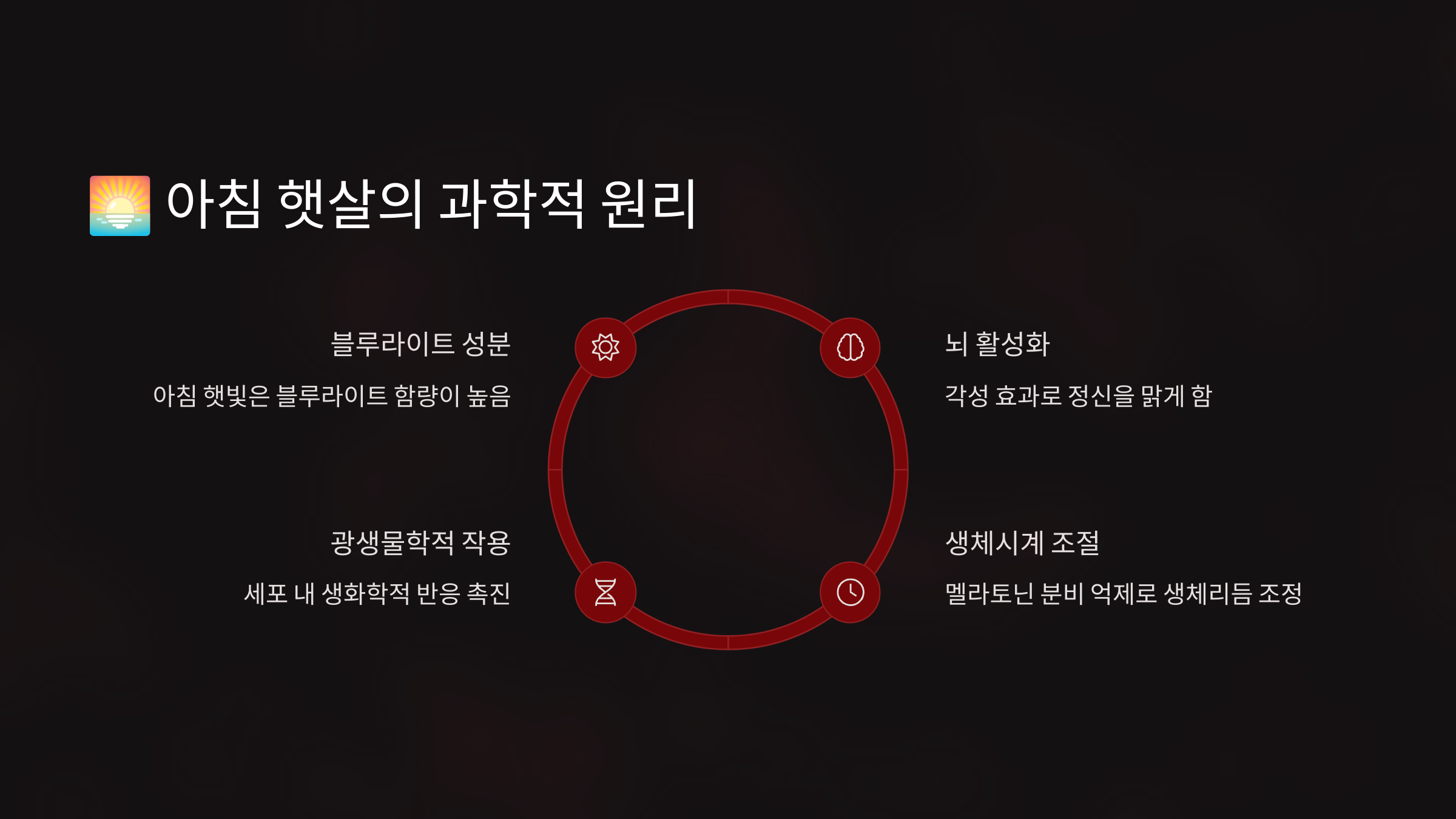 생체리듬은 우리 몸의 내재된 24시간 주기 시계예요. 이 시계는 뇌의 시상하부에 있는 시교차상핵(SCN)이라는 작은 조직에서 조절되는데, 약 2만 개의 신경세포가 복잡한 네트워크를 이루며 우리 몸의 모든 생리적 활동을 시간에 맞춰 조절해요. 아침 햇살은 이 생체시계를 정확하게 맞춰주는 가장 강력하고 자연스러운 동조 신호(zeitgeber) 역할을 해요.