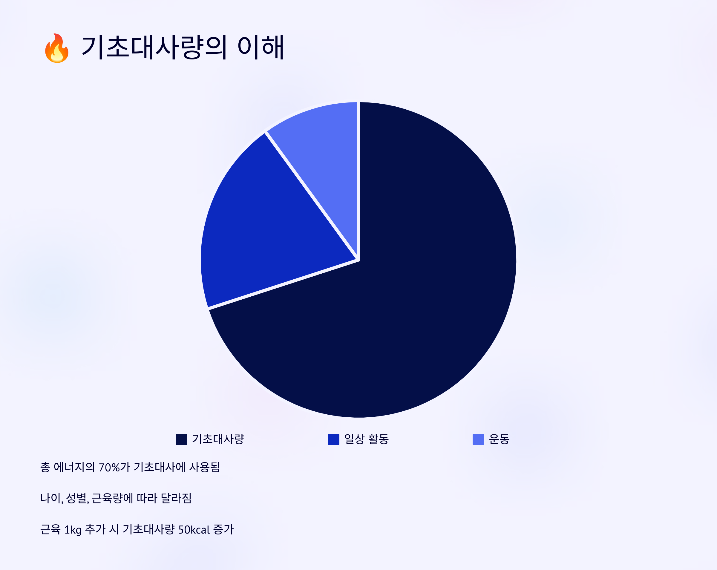 기초대사량은 우리 몸이 생존을 위해 최소한으로 필요한 에너지양을 의미해요. 숨 쉬고, 심장이 뛰고, 체온을 유지하는 등 기본적인 생명활동에 쓰이는 칼로리랍니다. 이 기초대사량이 높을수록 가만히 있어도 더 많은 칼로리를 소모하게 되죠.