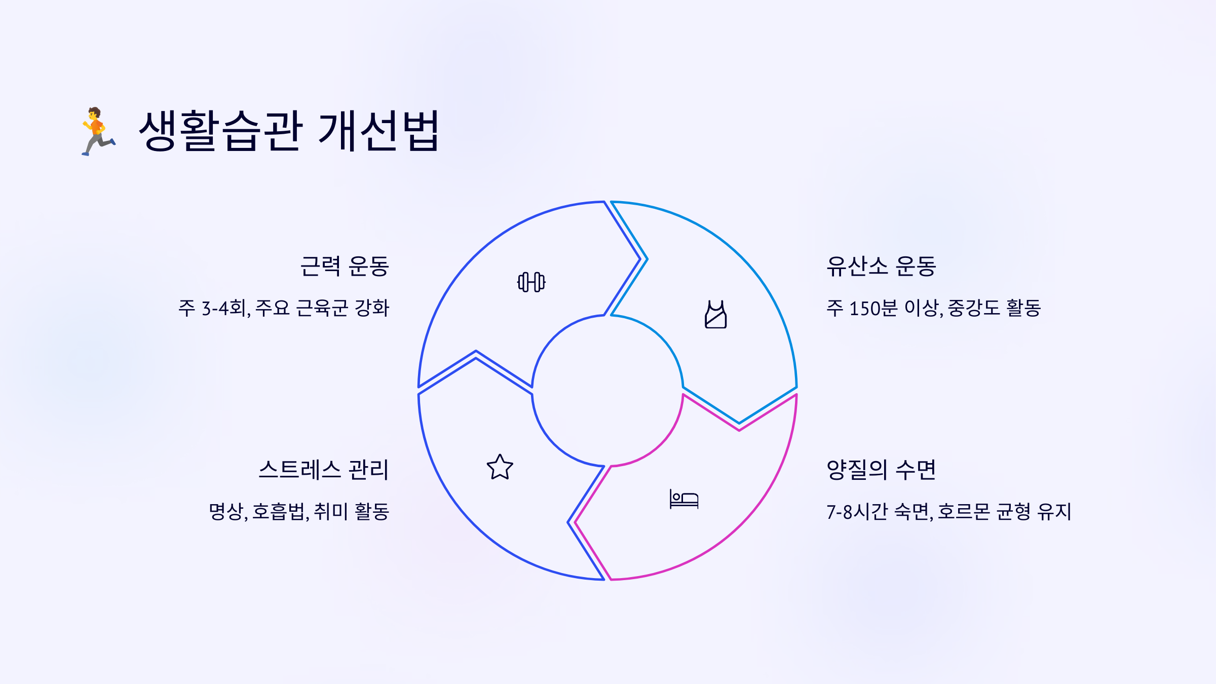 | 스트레스 관리 | 매일 10-15분 | 코르티솔 조절, 대사 정상화 |