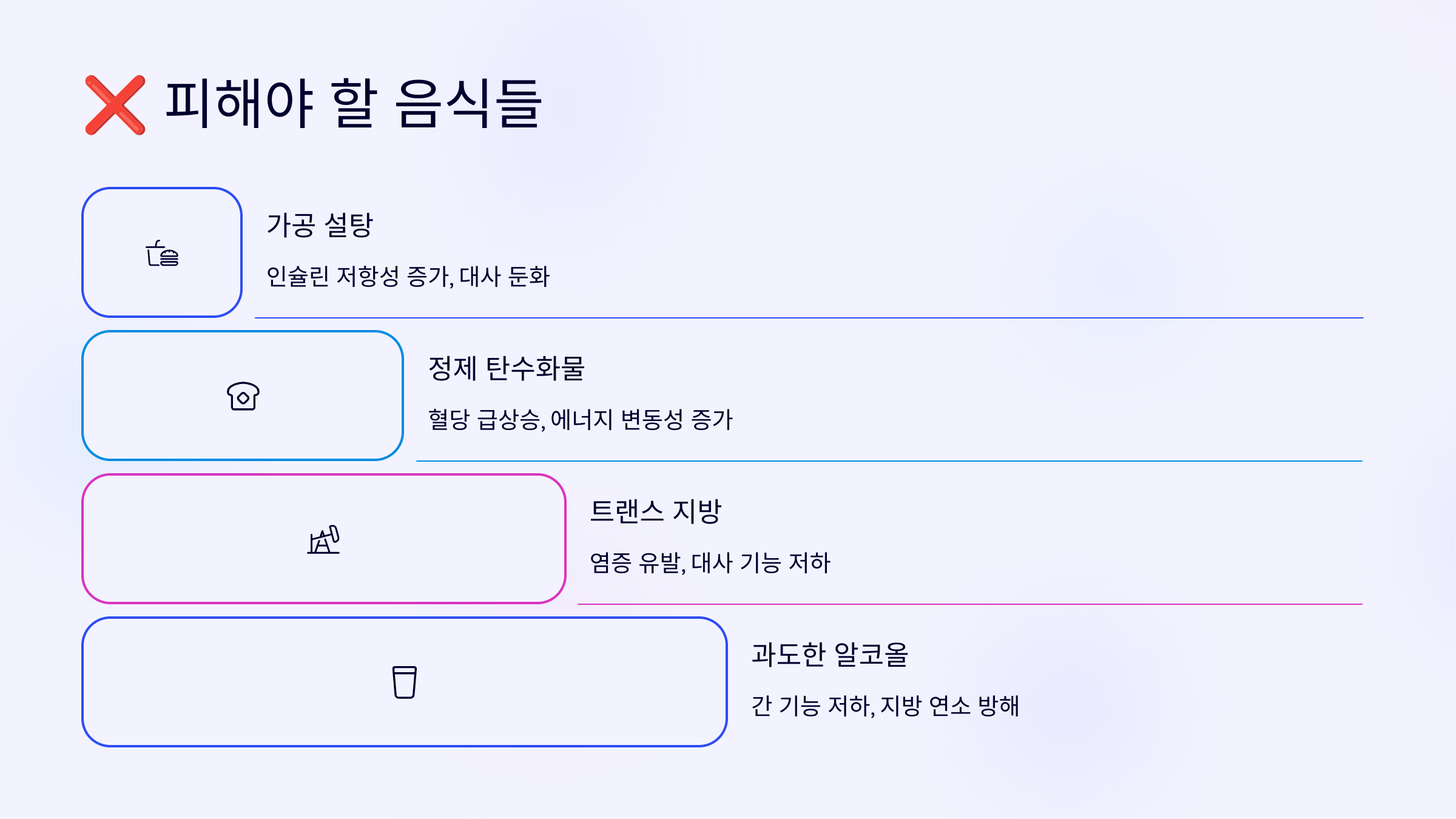 기초대사량을 높이려면 어떤 음식을 먹어야 하는지도 중요하지만, 어떤 음식을 피해야 하는지도 똑같이 중요해요. 특정 음식들은 대사를 방해하거나 느리게 만들어서 기초대사율을 떨어뜨릴 수 있거든요. 이런 음식들을 알아두고 가능한 한 피하거나 섭취량을 줄이는 것이 좋답니다.