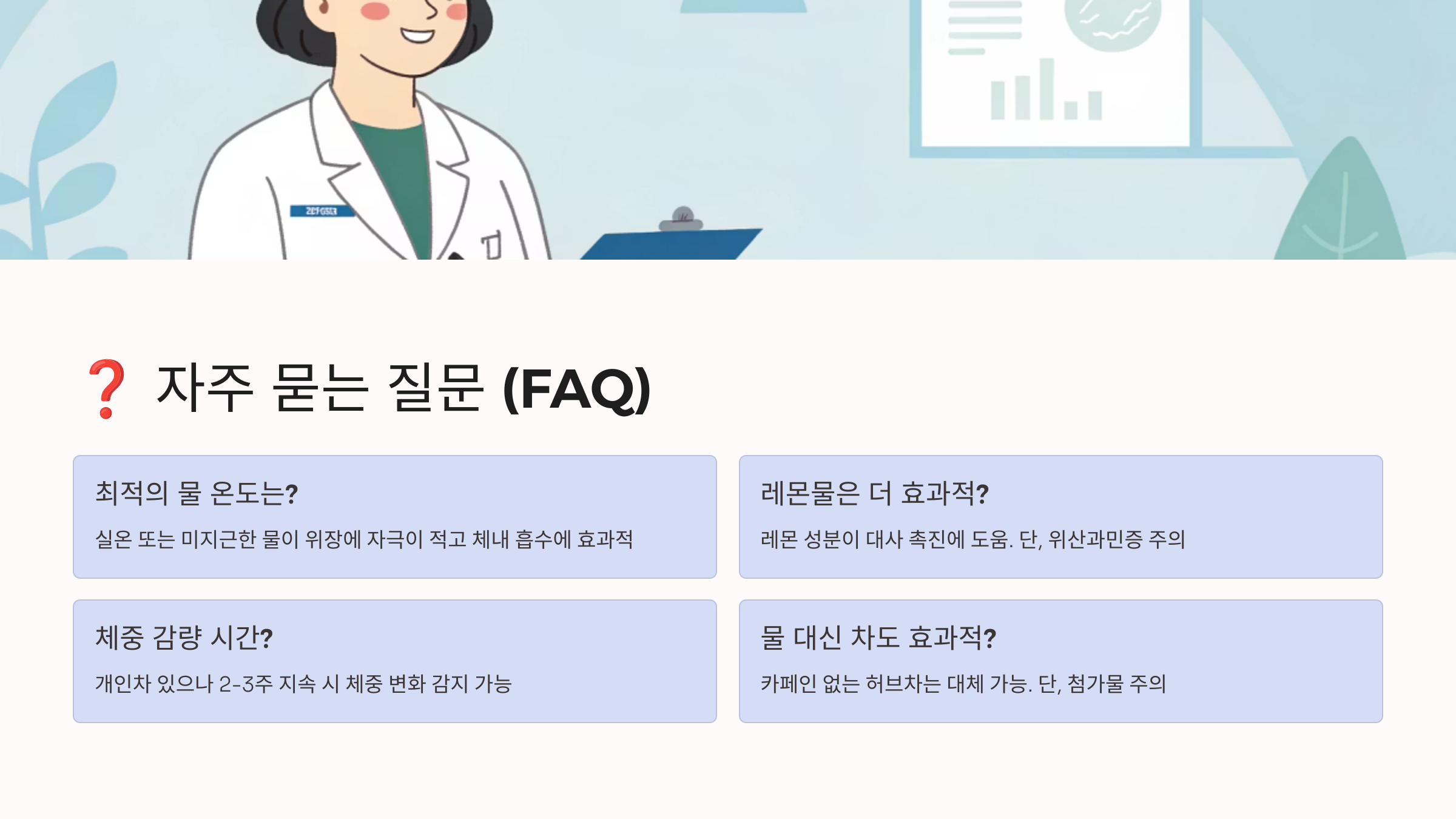 A2. 미지근한 물(36-37도)이 가장 좋아요. 너무 차가운 물은 위장을 자극할 수 있고, 뜨거운 물은 식도와 위 점막에 손상을 줄 수 있거든요. 체온과 비슷한 온도의 물이 가장 부담 없이 흡수되면서도 효과적이에요.