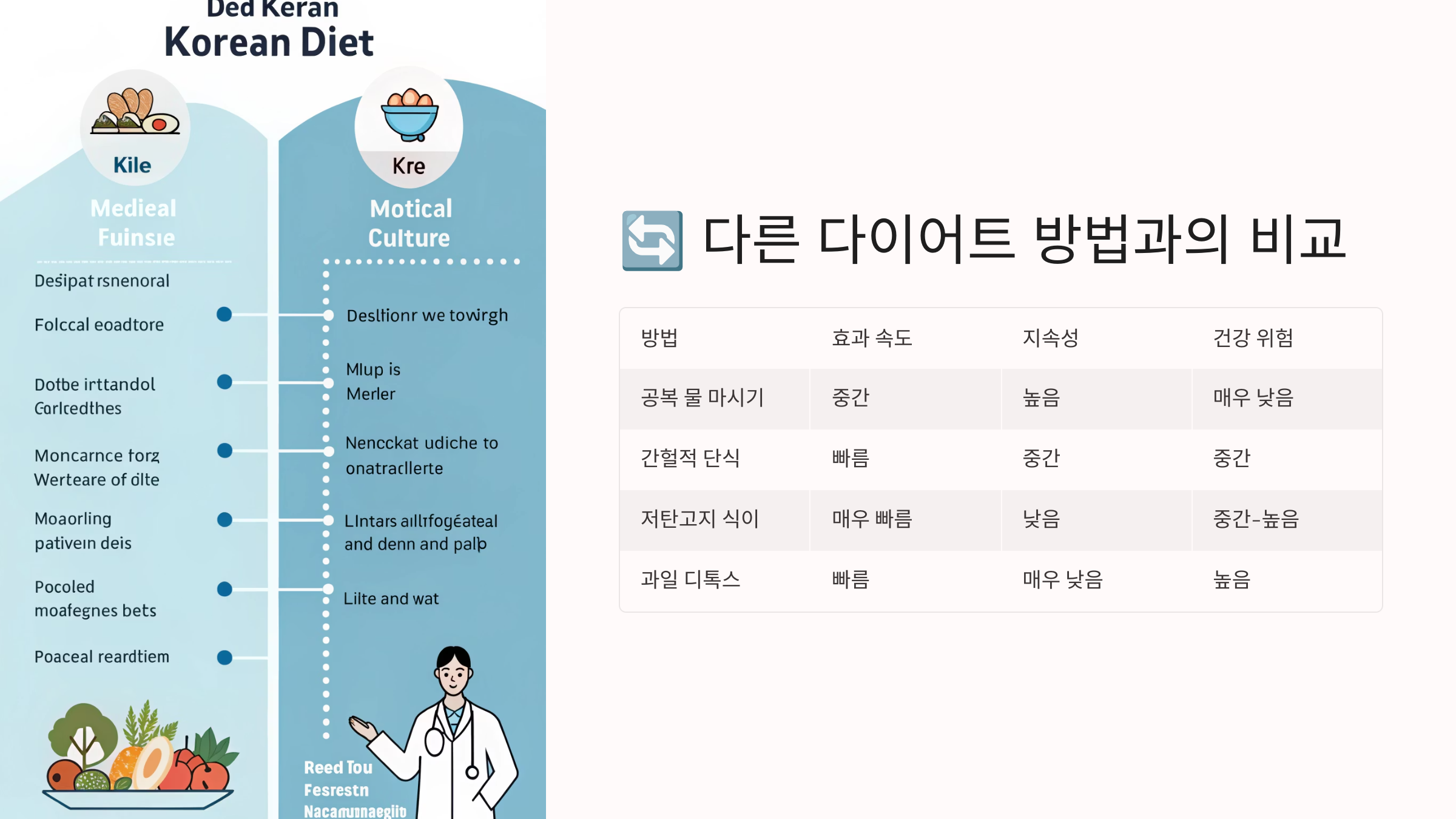 키토 다이어트와 비교해 보면 더욱 확실한 차이가 보여요. 키토 다이어트는 탄수화물을 극도로 제한해서 빠른 체중 감량을 유도하지만, 케토플루, 변비, 영양 불균형 등의 부작용이 있을 수 있어요. 반면 공복 물 마시기는 부작용이 거의 없고 누구나 안전하게 실천할 수 있어요. 다만 키토 다이어트의 체중 감량 속도가 훨씬 빨라서 단기간에 결과를 보고 싶은 사람들에게는 아쉬울 수 있어요.