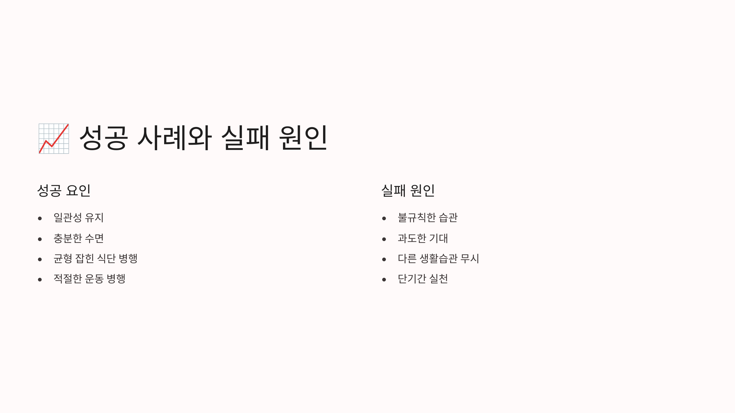 | 실천 방법 | 꾸준함, 적정량 | 과량 섭취, 불규칙 |
