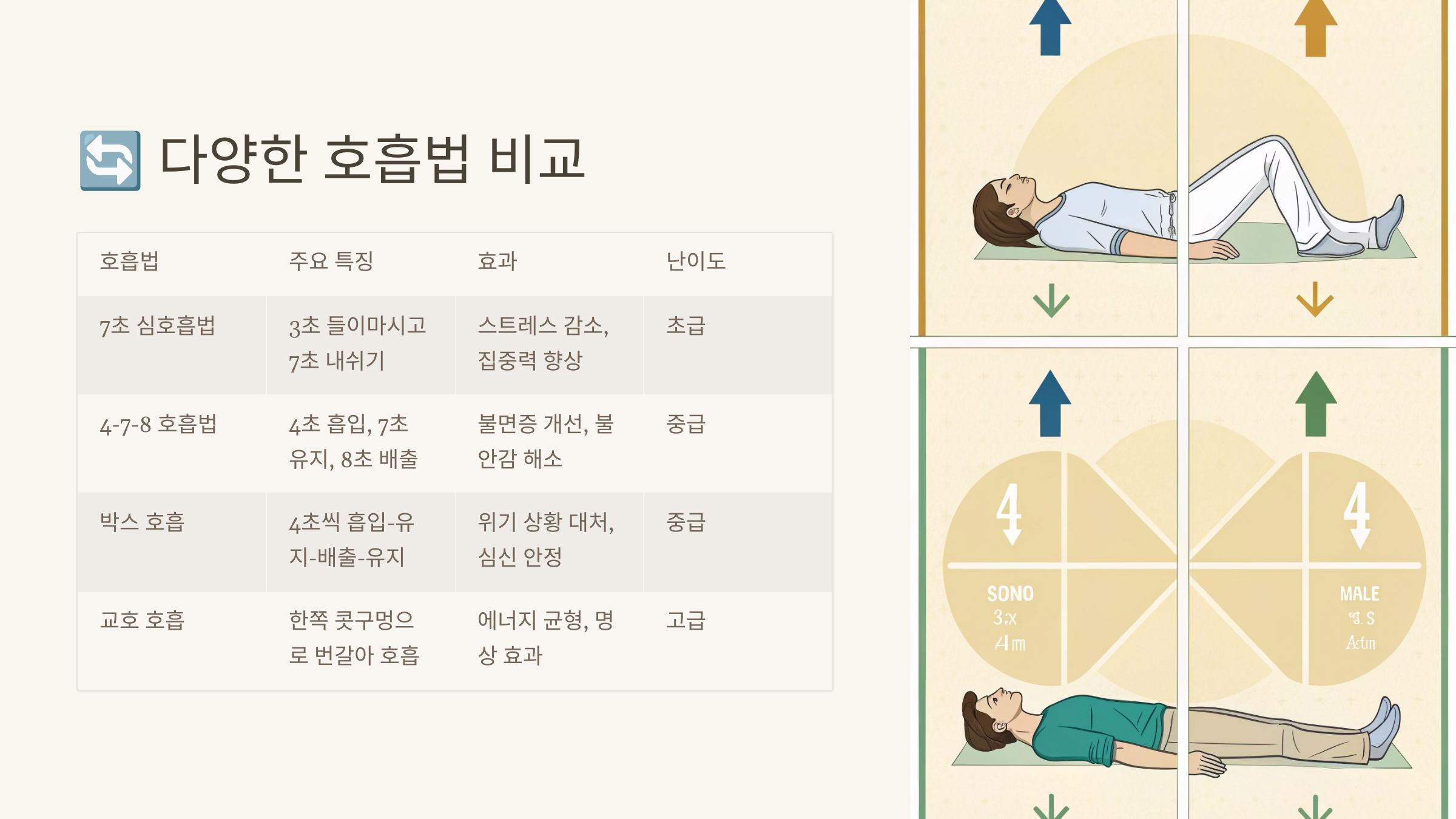 | 호흡법 | 난이도 | 효과 속도 | 실용성 |