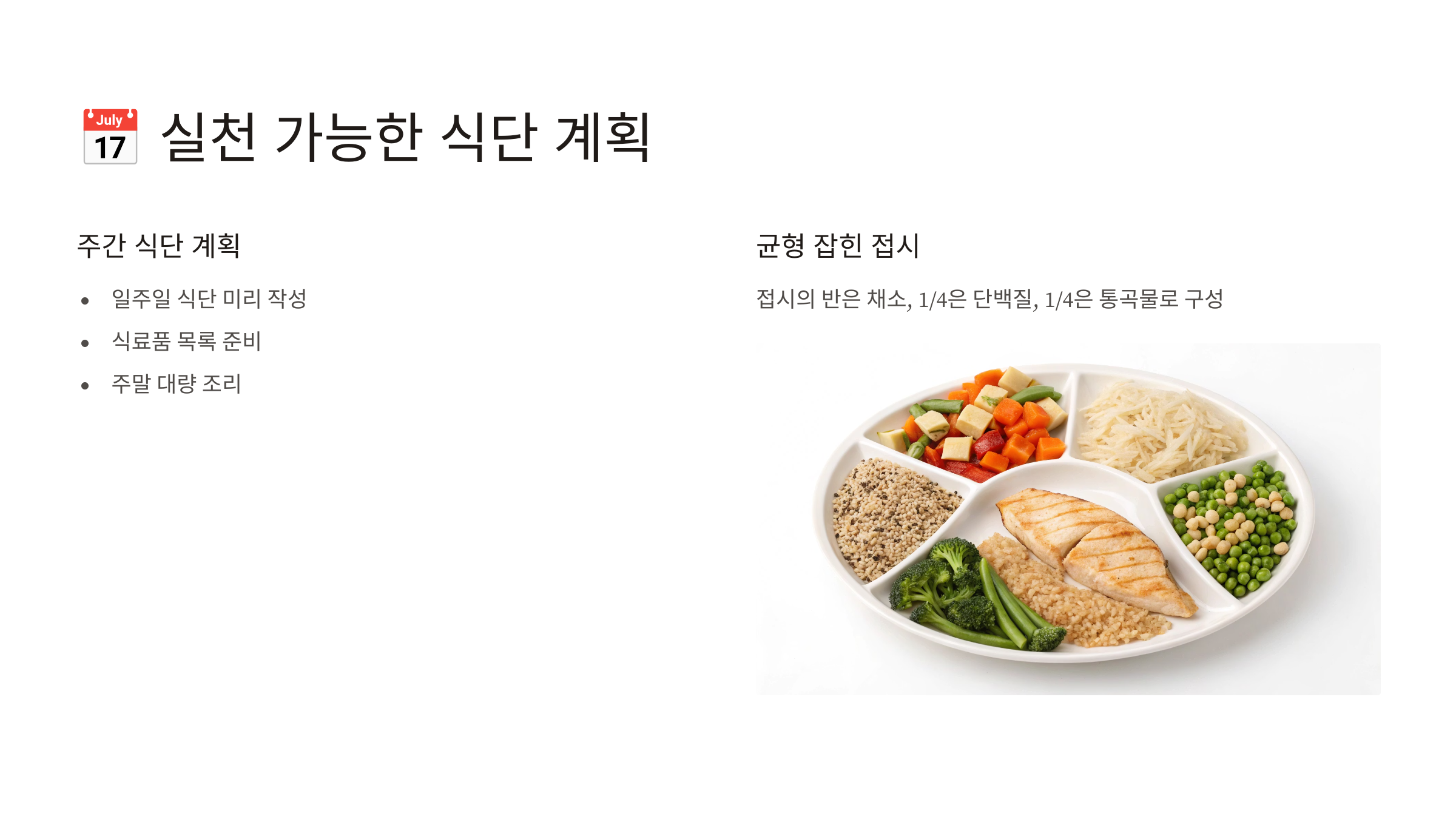 실천 가능한 식단 계획을 세우는 것은 건강한 식습관 정착의 핵심이에요. 많은 사람들이 완벽한 식단을 만들려고 하다가 복잡하고 실행하기 어려운 계획을 세우는 실수를 해요. 대신 간단하고 현실적인 계획부터 시작하는 것이 좋아요. 일주일치 식단을 미리 계획하고, 장보기 목록을 작성해서 필요한 재료를 준비하는 습관을 기르세요. 이렇게 하면 즉흥적으로 건강하지 않은 음식을 선택할 가능성이 줄어들어요.