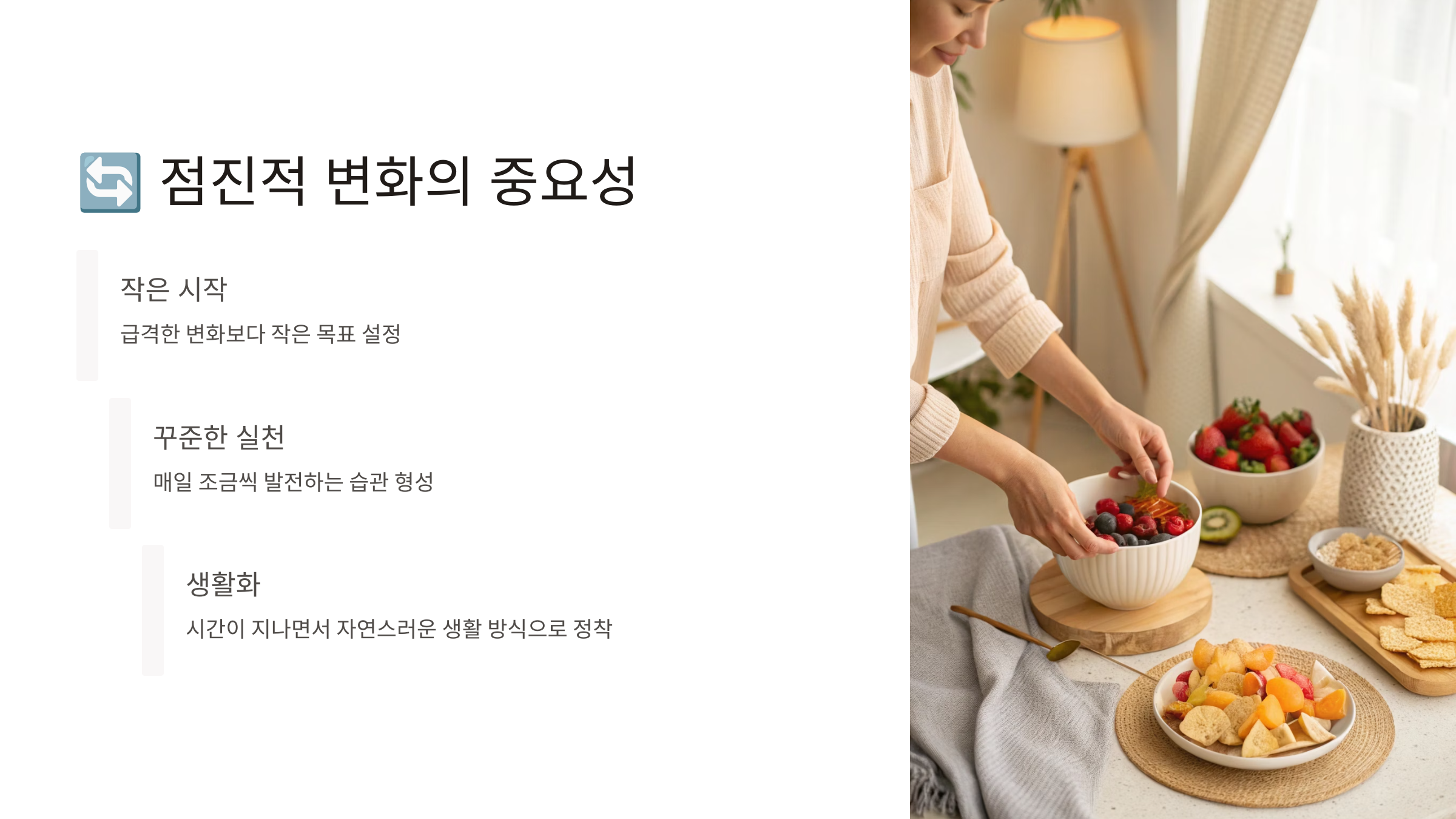 점진적 변화의 핵심은 작은 성공을 쌓아가는 것이에요. 하루에 채소 한 접시 더 먹기, 간식 대신 과일 먹기, 저염 조미료 사용하기 같은 작은 변화부터 시작해 보세요. 이런 작은 변화들이 습관이 되면 자연스럽게 더 큰 변화를 시도할 용기가 생겨요. 내가 생각했을 때 가장 중요한 것은 완벽하지 않아도 괜찮다는 마음가짐이에요. 하루 이틀 실수했다고 해서 포기하지 말고, 다시 시작하면 되는 거랍니다.