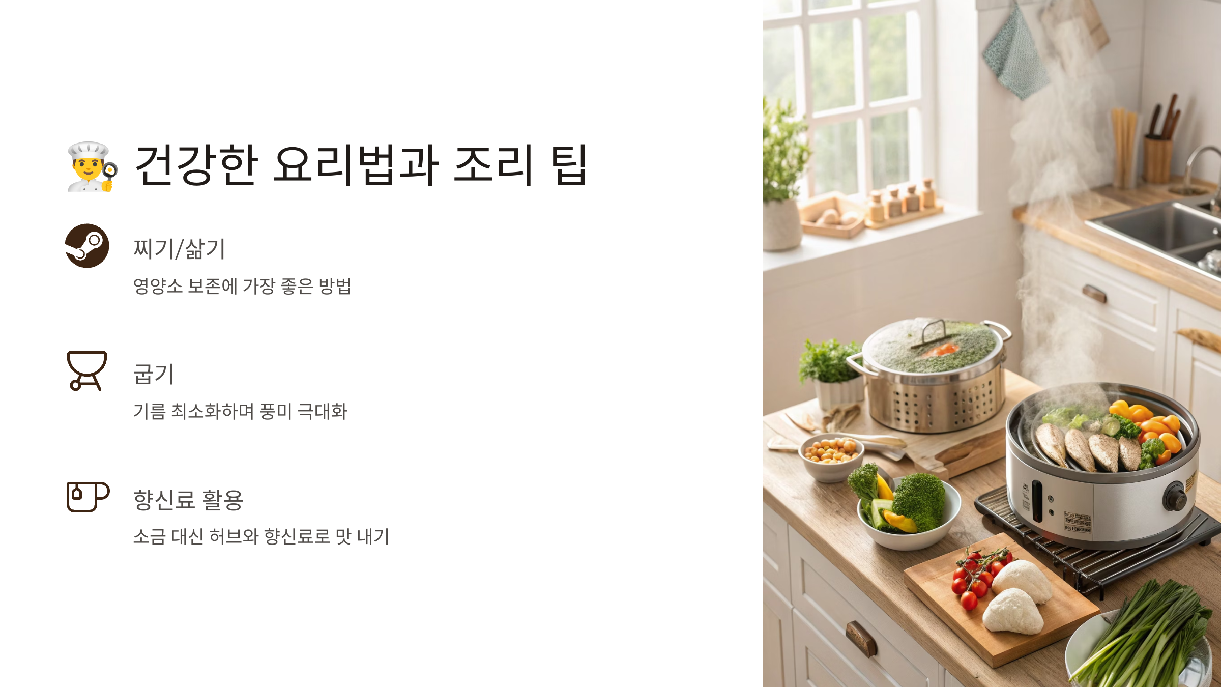 | 찜/삶기 | 영양소 보존, 저칼로리 | 브로콜리, 감자, 생선 | 과도한 가열 주의 |