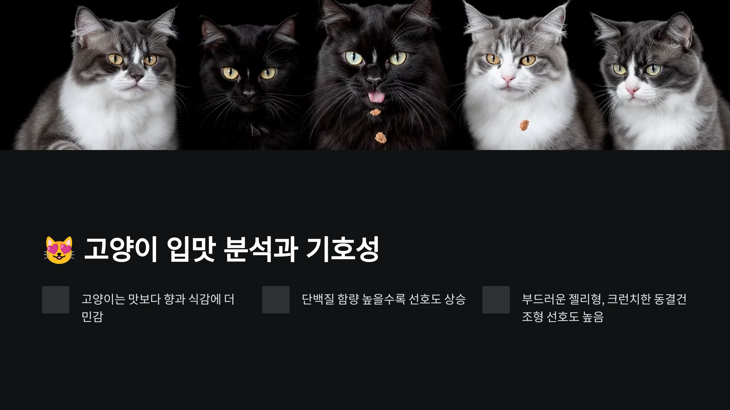 개체별 차이도 크답니다. 같은 품종이라도 개체마다 선호하는 맛과 질감이 달라요. 어릴 때부터 다양한 맛과 질감을 경험한 고양이는 성묘가 되어서도 다양한 간식을 잘 받아들이는 경향이 있어요. 반면 한 가지 맛에만 익숙한 고양이는 새로운 간식을 거부할 수 있답니다.
