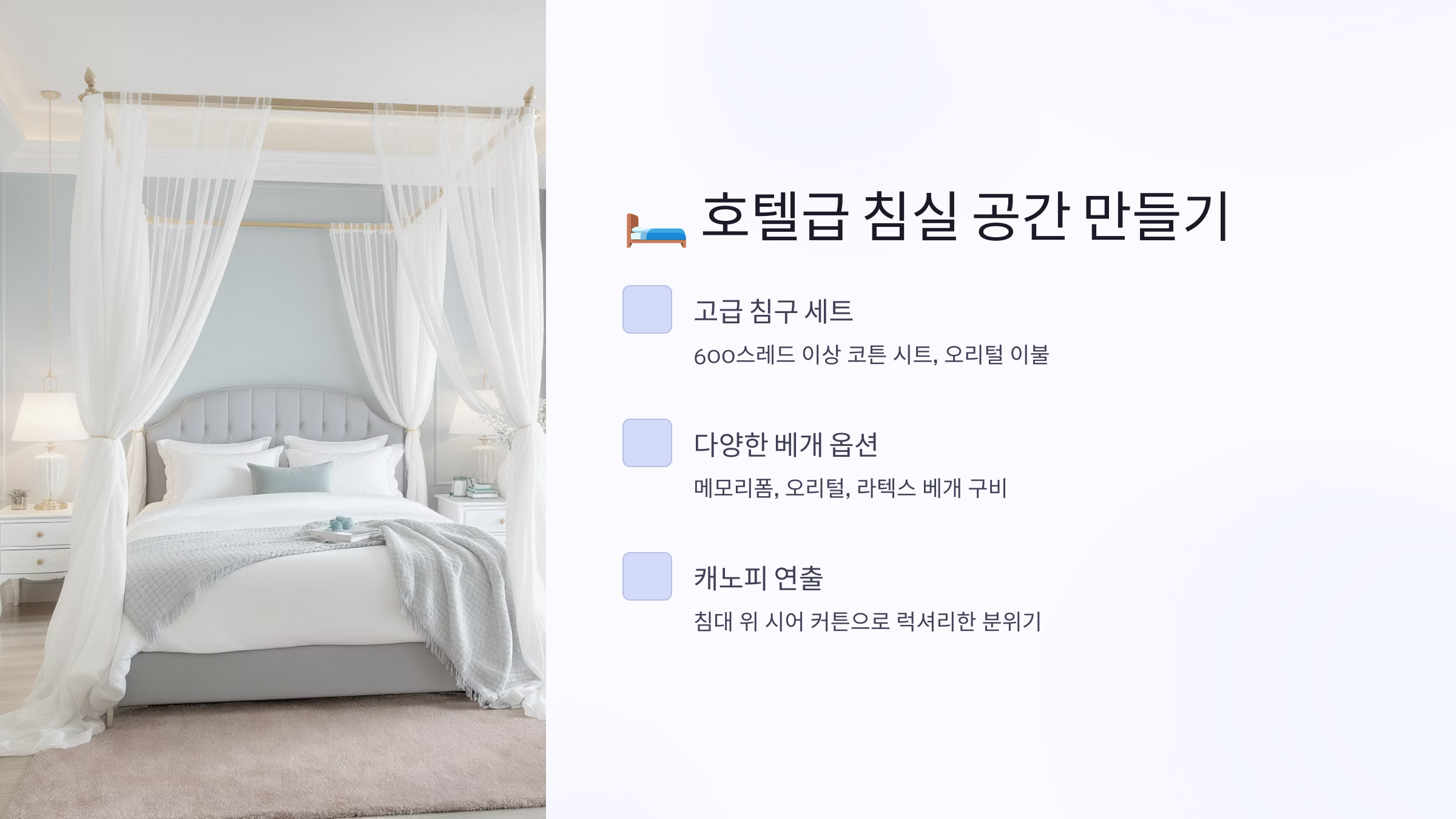 호텔 스위트룸의 가장 큰 매력은 편안하면서도 고급스러운 침실이에요. 홈캠핑에서도 이런 분위기를 충분히 연출할 수 있답니다. 먼저 침구부터 바꿔보세요. 호텔처럼 하얀색 시트와 푹신한 거위털 이불을 준비하면 기본은 완성이에요.