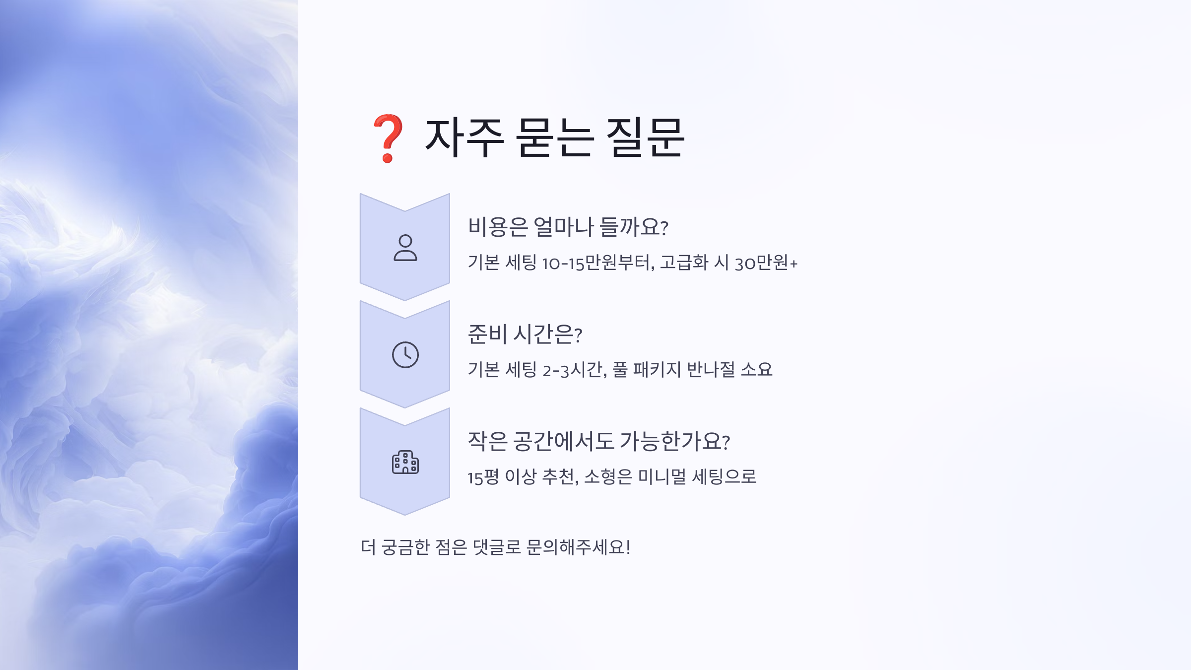 A1. 처음부터 모든 걸 갖추려고 하면 부담스러울 수 있지만, 단계별로 준비하면 충분히 가능해요! 기존에 있는 물건들을 재배치하고 작은 소품들만 추가해도 분위기가 확 달라진답니다. DIY로 만들거나 중고 제품을 활용하는 것도 좋은 방법이에요. 중요한 건 얼마를 쓰느냐가 아니라 어떻게 연출하느냐랍니다!