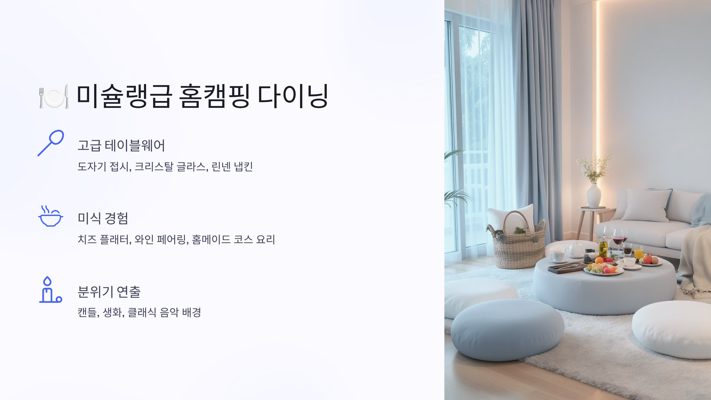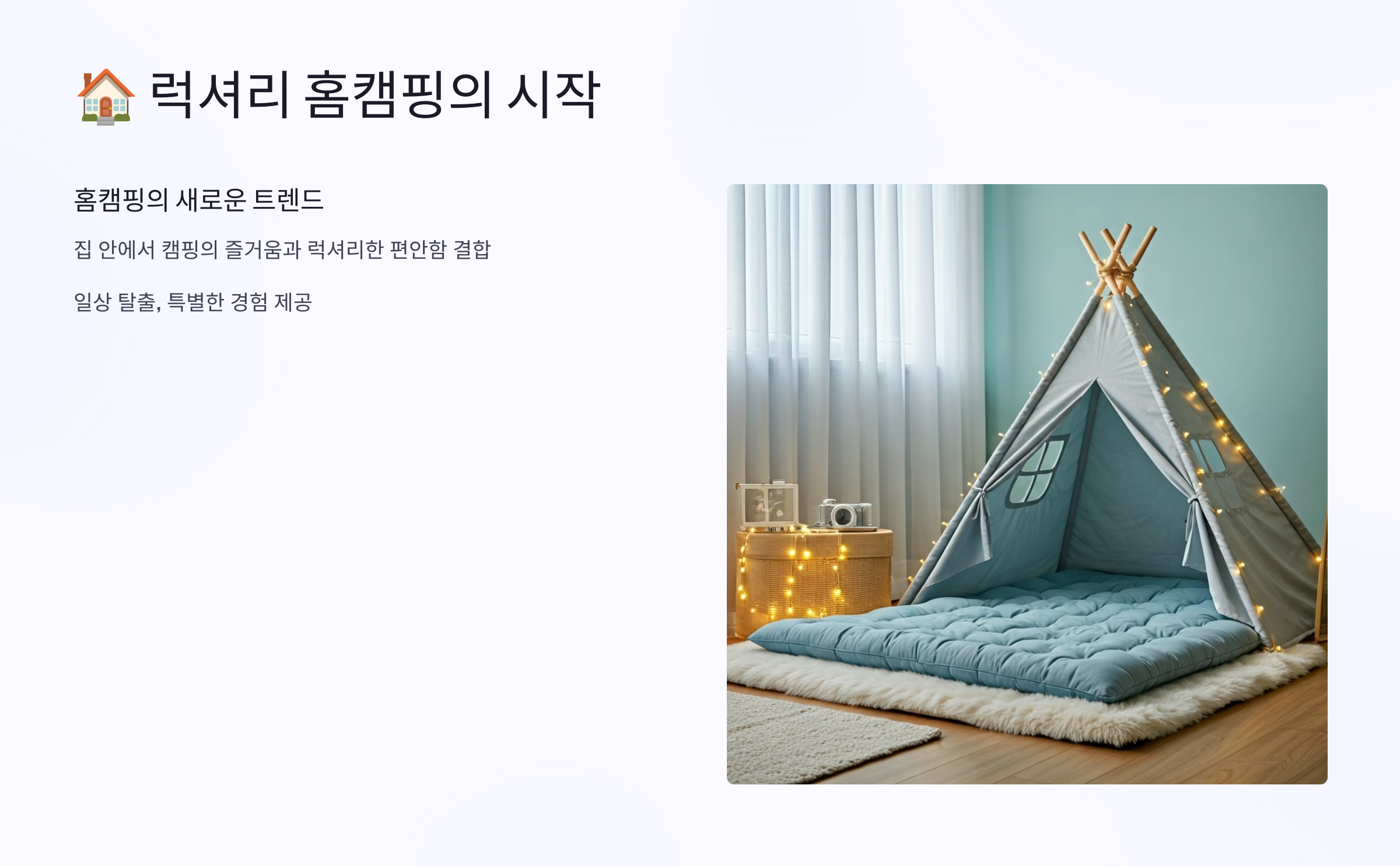 럭셔리 홈캠핑은 단순한 트렌드가 아니라 새로운 라이프스타일이에요. 집에서도 충분히 특별한 경험을 만들 수 있다는 것을 보여주는 좋은 예시랍니다. 이제 우리 집을 나만의 프라이빗 호텔로 만들어볼까요? 🏡✨