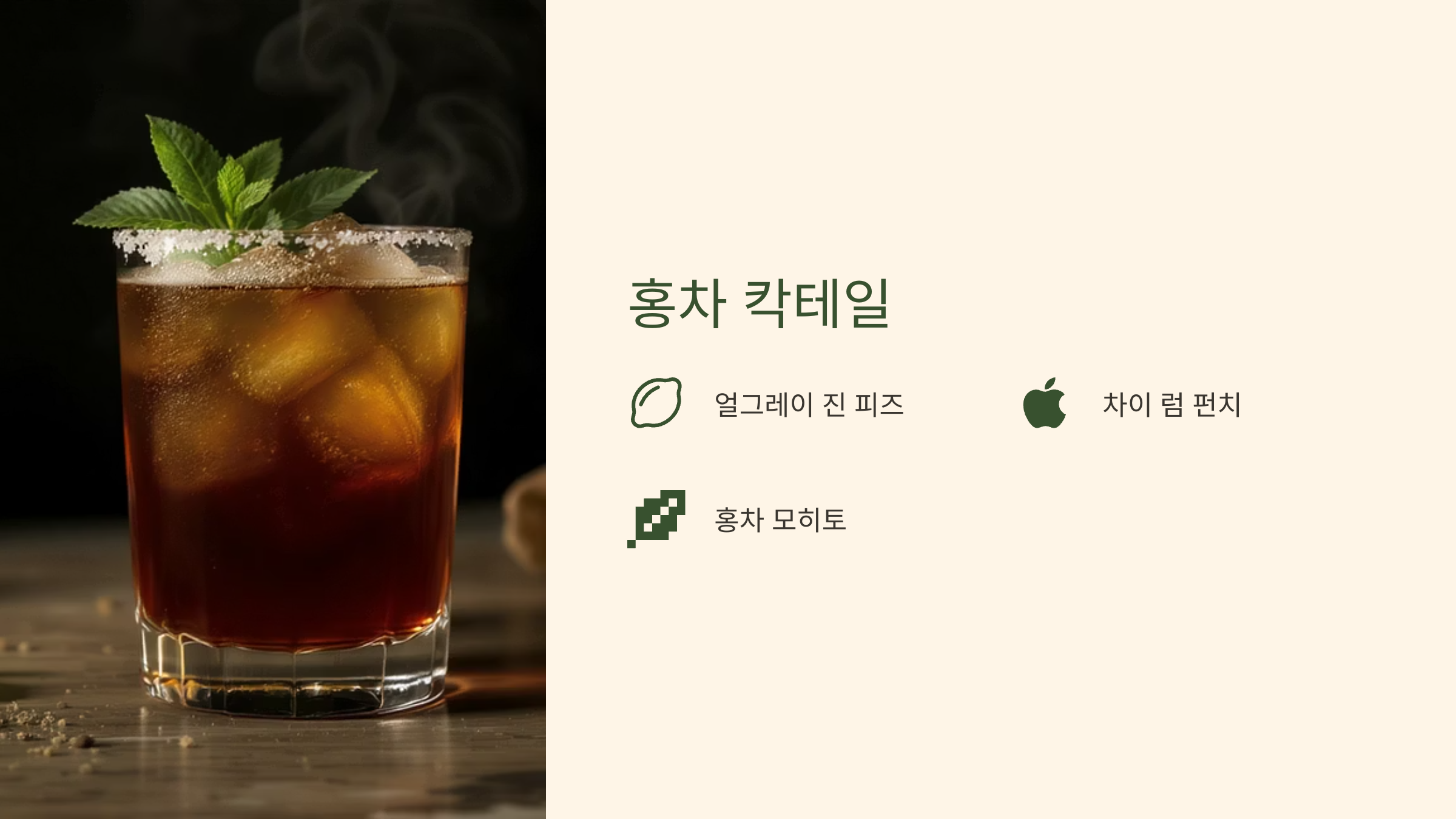 홍차를 활용한 칵테일과 목테일은 최근 바텐더들 사이에서 큰 인기를 끌고 있어요. 홍차의 복잡한 향미는 다양한 주류나 과일과 만나 새로운 맛의 세계를 열어줘요. 가장 기본적인 홍차 칵테일은 '티 마티니'예요. 진한 얼그레이를 차갑게 식혀 보드카와 섞고, 레몬 트위스트로 장식하면 우아한 칵테일이 완성돼요. 위스키와 홍차를 섞은 '티 올드패션드'도 클래식한 맛을 자랑하죠.