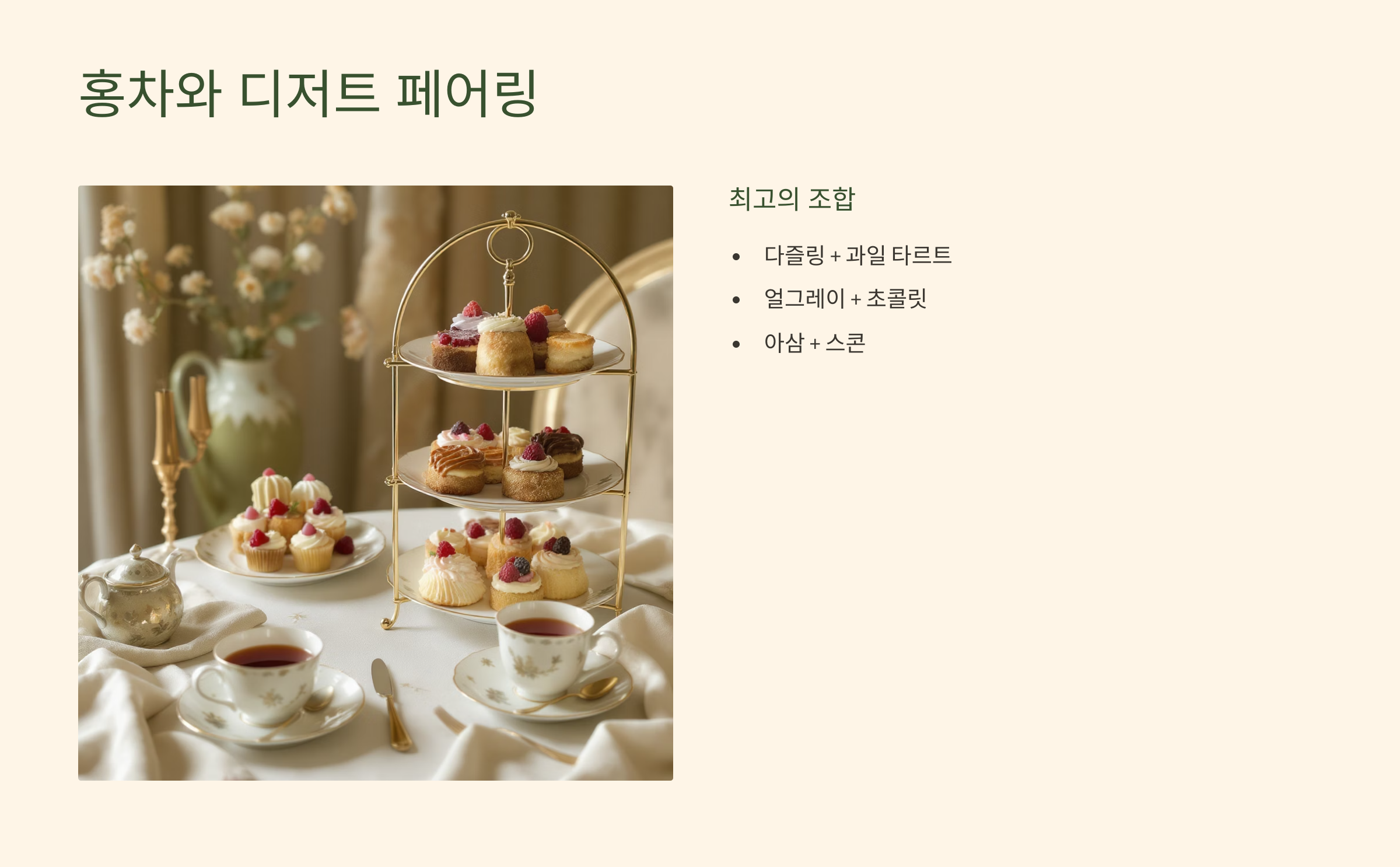 영국식 애프터눈 티의 전통을 따르면 더욱 우아한 페어링을 즐길 수 있어요. 스콘에는 잉글리시 브렉퍼스트나 실론이 잘 어울려요. 클로티드 크림과 잼의 달콤함을 홍차의 떫은맛이 중화시켜 주거든요. 핑거 샌드위치에는 가벼운 다즐링이나 화이트 티가 좋고, 페이스트리류에는 중간 정도 바디감의 기문홍차가 적당해요. 이렇게 3단 트레이의 각 층에 맞는 홍차를 페어링 하면 완벽한 티타임이 완성돼요.