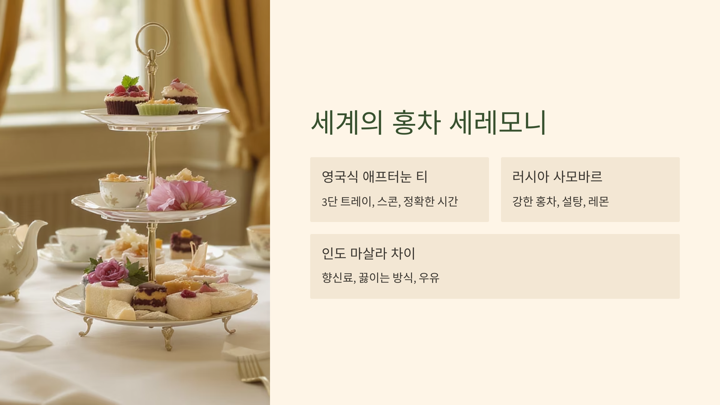 세계 각국의 홍차 문화는 그 나라의 역사와 전통을 반영해요. 영국의 애프터눈 티는 1840년대 베드포드 공작부인이 시작한 것으로, 오후 3-5시 사이에 즐기는 우아한 의식이에요. 3단 트레이에 샌드위치, 스콘, 페이스트리를 올리고, 정해진 순서대로 먹는 것이 전통이에요. 찻잔을 들 때는 손잡이를 엄지와 검지로 잡고, 중지로 받쳐주는 것이 올바른 에티켓이랍니다.