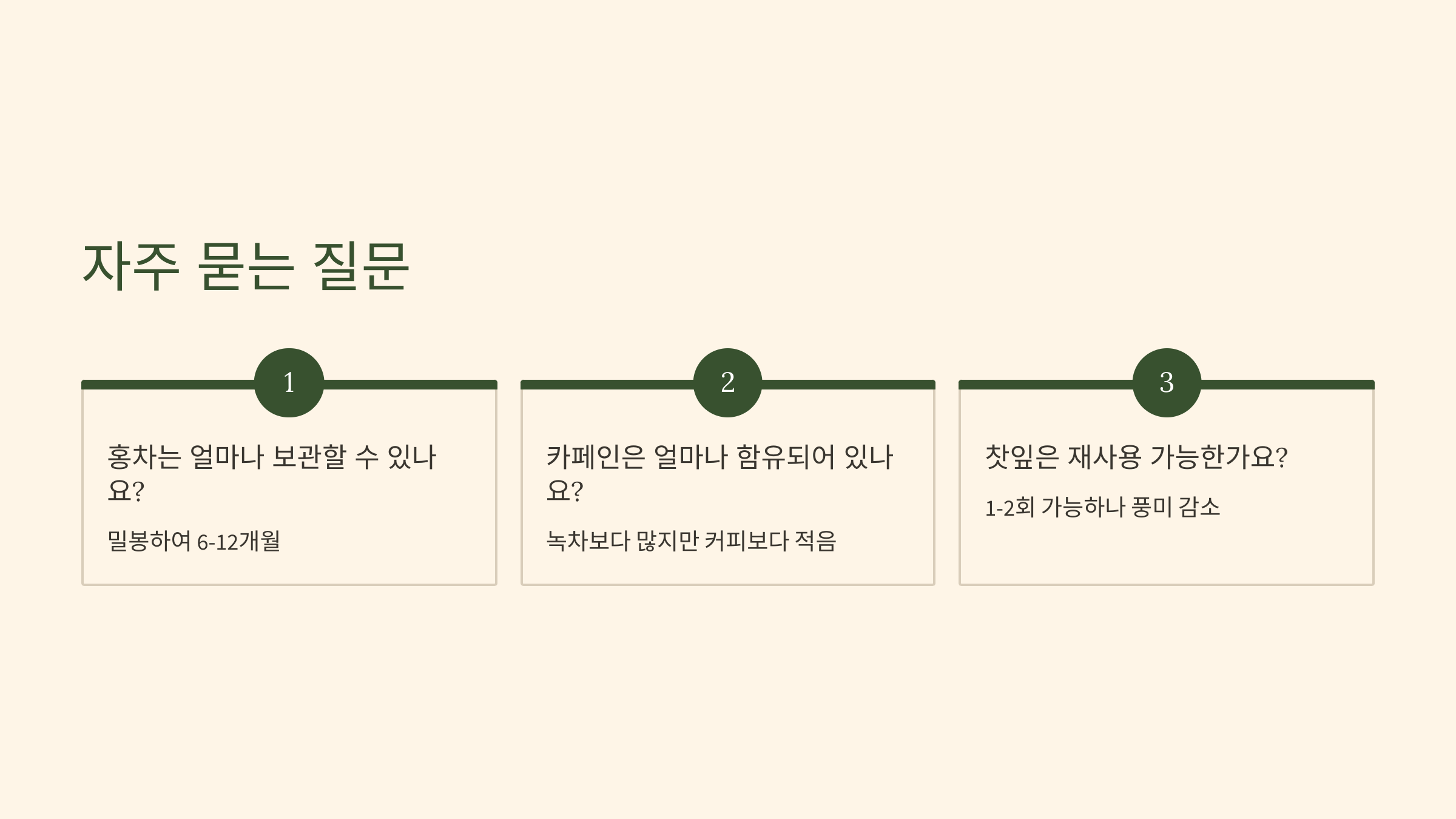 A5. 홍차는 빛, 습기, 냄새, 공기를 피해 보관해야 해요. 밀폐 용기에 넣어 서늘하고 건조한 곳에 보관하세요. 냉장고는 습기와 냄새 때문에 피하는 것이 좋아요. 개봉 후 6개월 이내에 마시는 것이 가장 좋고, 향이 첨가된 홍차는 더 빨리 소비하는 것이 좋답니다.