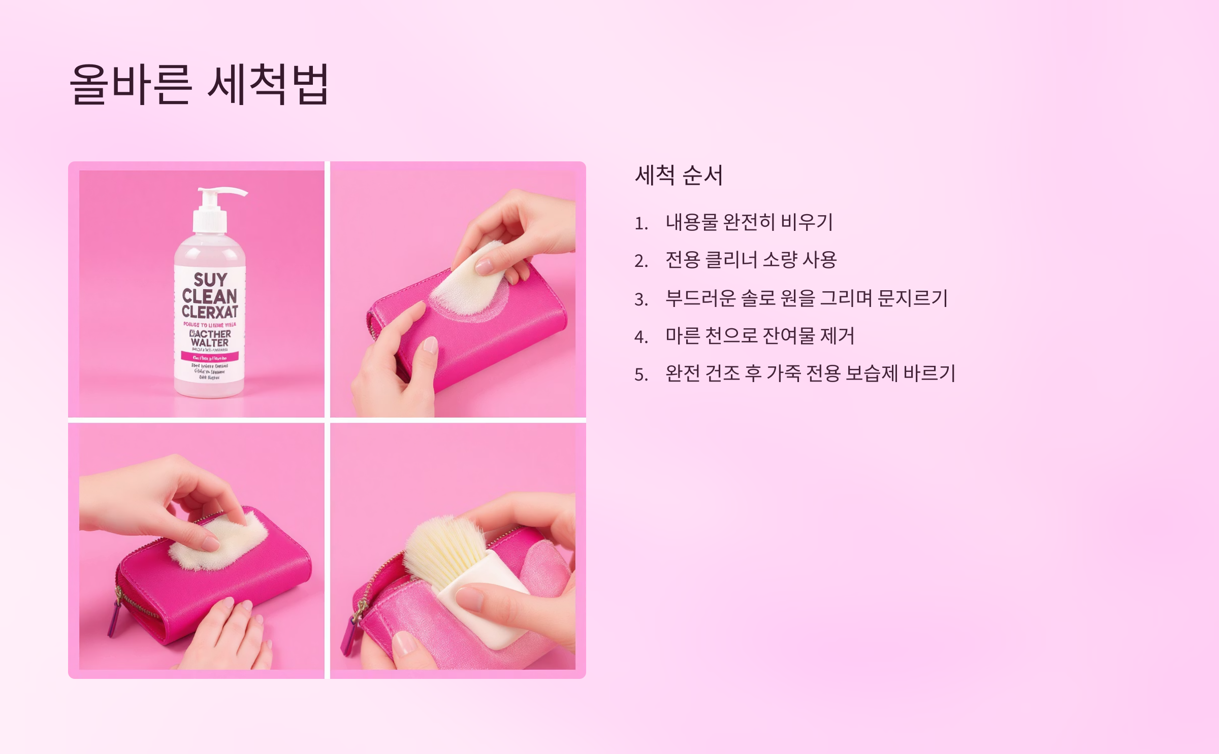 심한 오염이나 얼룩은 전문 클리너를 사용해야 해요. 가죽 클리너를 부드러운 천에 묻혀 원을 그리듯 부드럽게 문질러주세요. 한 번에 너무 많은 양을 사용하면 가죽이 변색될 수 있으니, 소량씩 여러 번 반복하는 것이 좋아요. 클리닝 후에는 충분히 건조해야 해요. 🧽