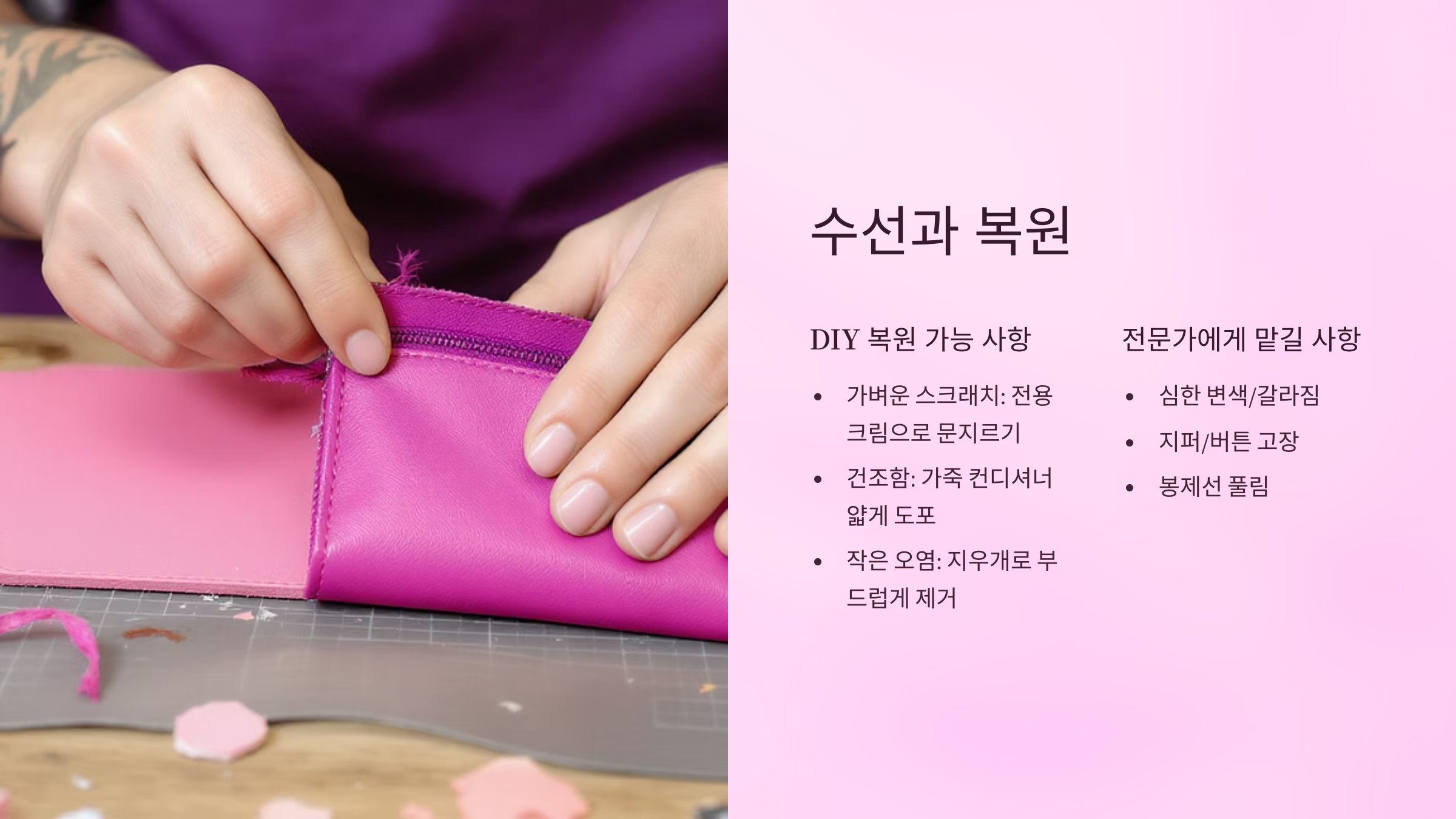 전문가의 도움이 필요한 경우를 판단하는 것도 중요해요. 구조적인 손상, 대면적의 찢어짐, 내부 구조의 문제 등은 DIY로 해결하기 어려워요. 무리해서 직접 수선하다가 더 큰 손상을 입힐 수 있으니, 이런 경우에는 가죽 공방이나 명품 수선 전문점을 찾아가세요. 비용이 들더라도 전문가의 손길로 제대로 복원하는 것이 장기적으로 더 경제적이에요. 💰