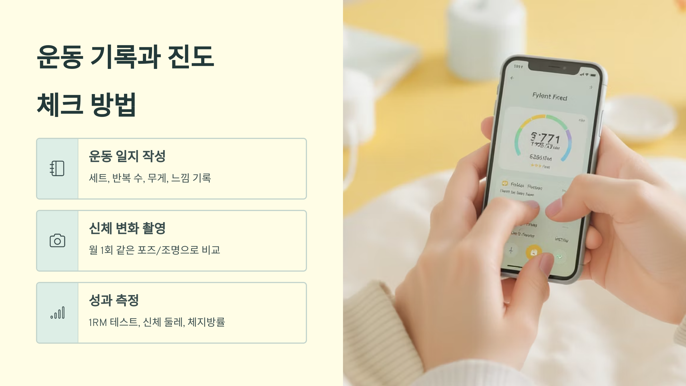 가장 기본적인 기록은 운동 일지예요. 날짜, 운동 종목, 세트 수, 반복 횟수, 사용 무게를 빠짐없이 기록하세요. 디지털이 편하신 분들은 스마트폰 앱을 활용하고, 아날로그를 선호하시면 노트에 직접 작성하는 것도 좋아요. 중요한 건 꾸준히 기록하는 습관을 만드는 거예요.