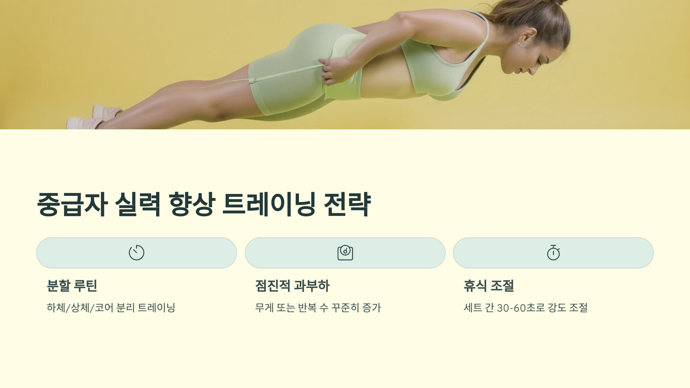 | 1주차 | 스쿼트 10회x3 변형 푸시업 8회x3 플랭크 20초x3 |