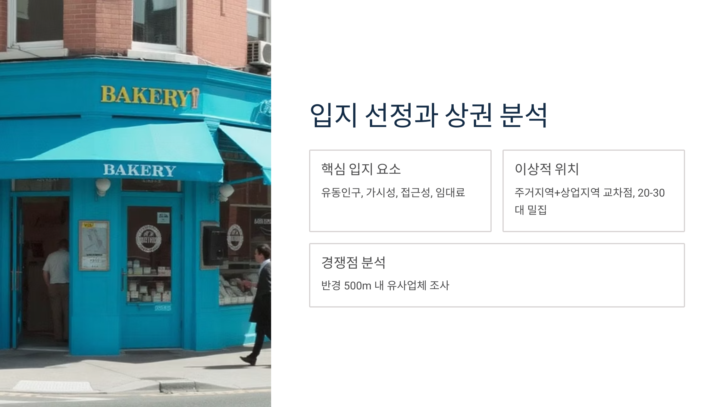 상권 분석을 할 때는 반경 500m 이내의 경쟁 업체 현황을 파악하는 것이 중요해요. 비슷한 콘셉트의 베이커리가 있는지, 있다면 어떤 차별화 포인트를 가지고 있는지 꼼꼼히 조사해야 해요. 오히려 카페가 밀집된 지역이 시너지 효과를 낼 수 있어요. 카페를 찾는 고객들이 빵도 함께 구매하는 경우가 많거든요.