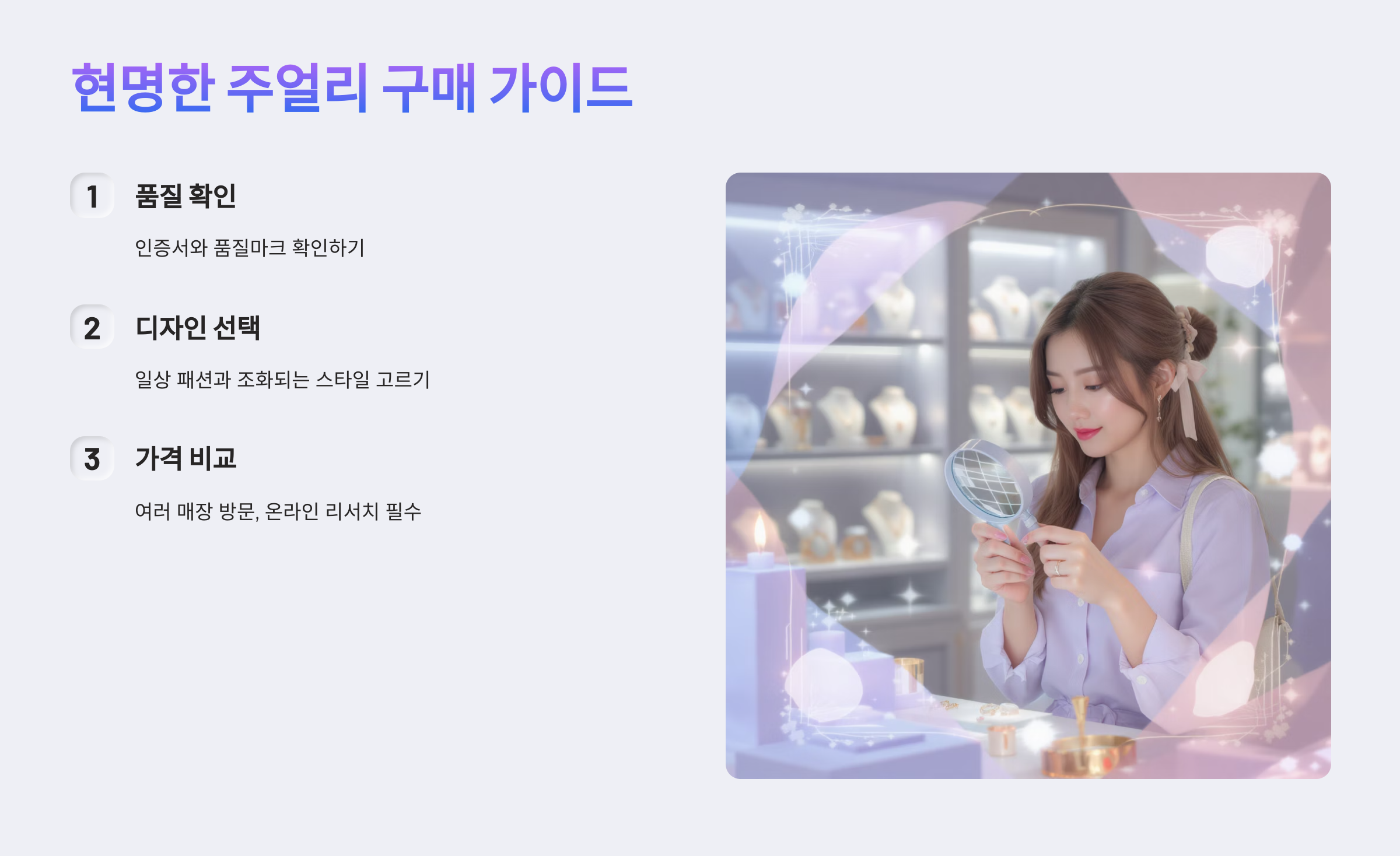 마지막으로 충동구매를 피하세요. 주얼리는 감정적인 구매가 되기 쉬운 아이템이에요. 구매 전 최소 하루 정도는 고민하는 시간을 가지세요. 정말 필요한지, 자주 착용할 것인지, 가지고 있는 옷이나 다른 주얼리와 잘 어울리는지 생각해 보세요. 특히 세일 기간에는 할인율에 현혹되지 말고 실제 필요성을 따져봐야 해요. 현명한 구매는 만족스러운 주얼리 라이프의 시작이랍니다! 💝