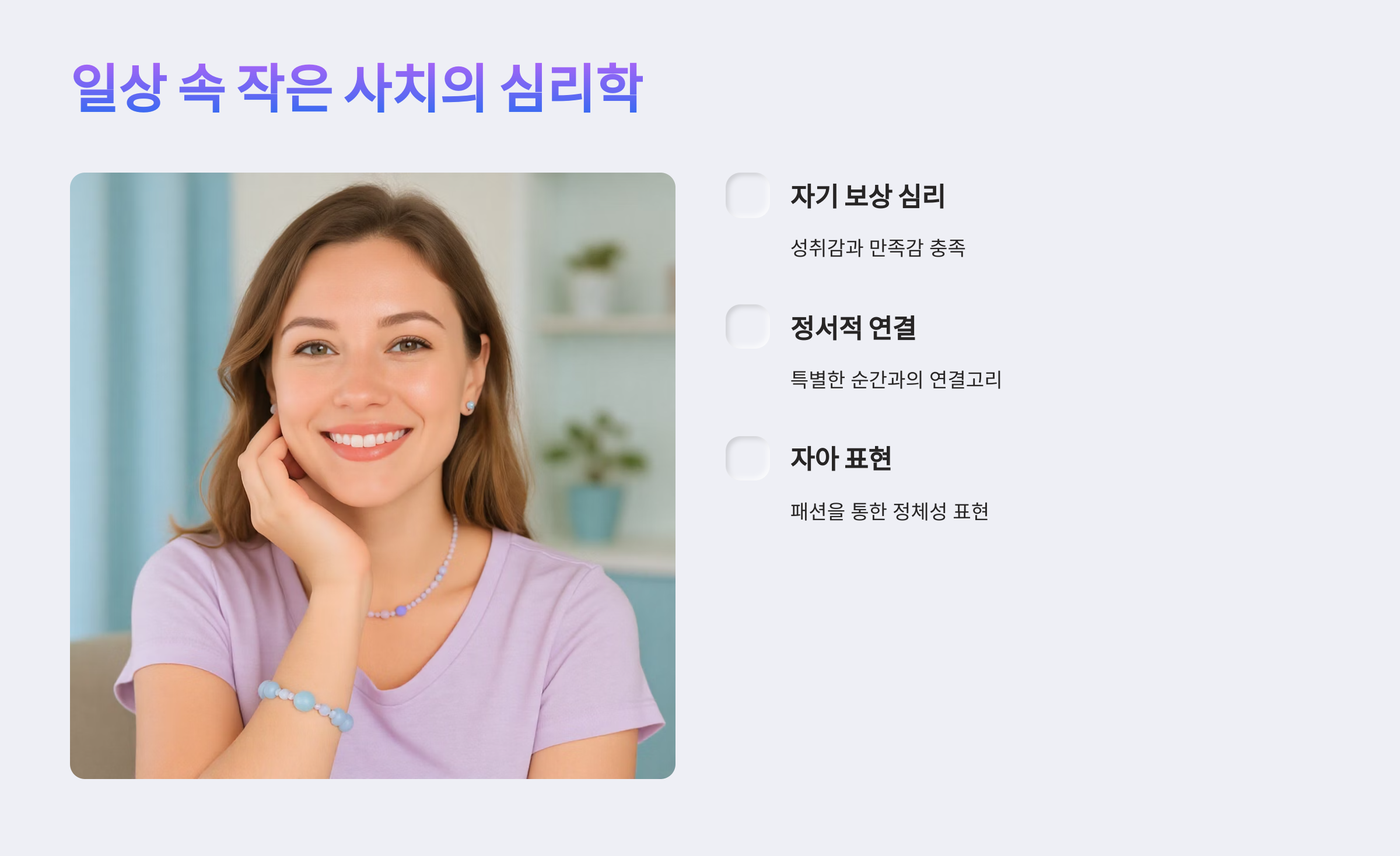 일상 속 작은 사치는 단순한 낭비가 아니라 정신 건강에 긍정적인 영향을 미치는 자기 돌봄의 한 형태예요. 심리학자들은 이를 '작은 사치 효과(Small Luxury Effect)'라고 부르며, 적절한 자기 보상이 스트레스 해소와 자존감 향상에 도움이 된다고 설명해요. 특히 주얼리처럼 매일 착용할 수 있는 아이템은 지속적인 만족감을 제공한답니다.