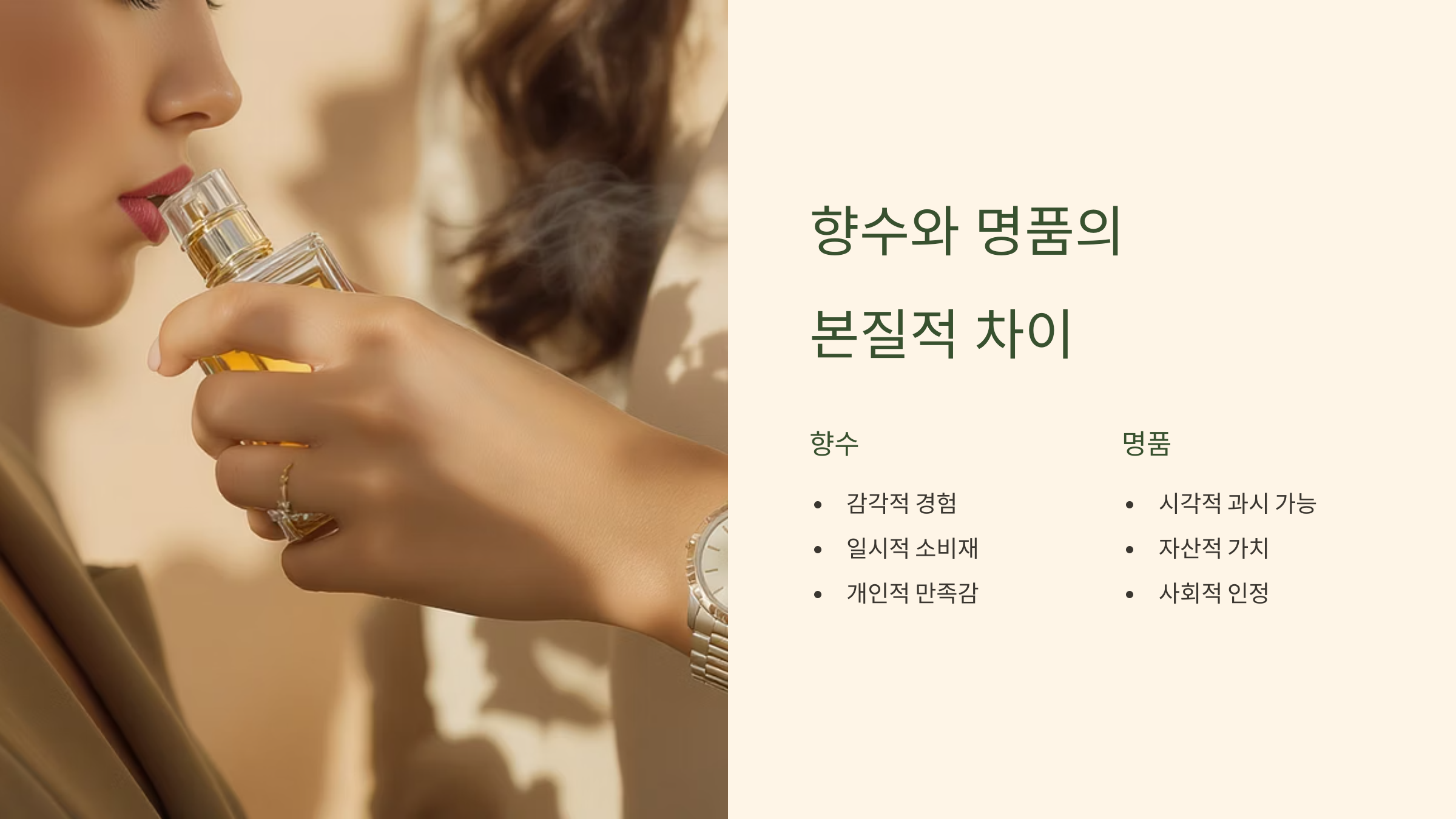 향수와 명품의 가장 큰 차이점은 제품의 본질에 있어요. 향수는 후각이라는 감각을 통해 경험하는 무형의 제품이에요. 눈에 보이지 않고 만질 수 없지만, 착용자의 기분과 주변 사람들의 인상에 강력한 영향을 미치죠. 반면 명품 가방이나 시계는 시각적으로 즉시 인지되는 유형의 제품이에요. 이 차이가 두 제품군의 모든 특성을 결정한다고 봐도 과언이 아니에요.