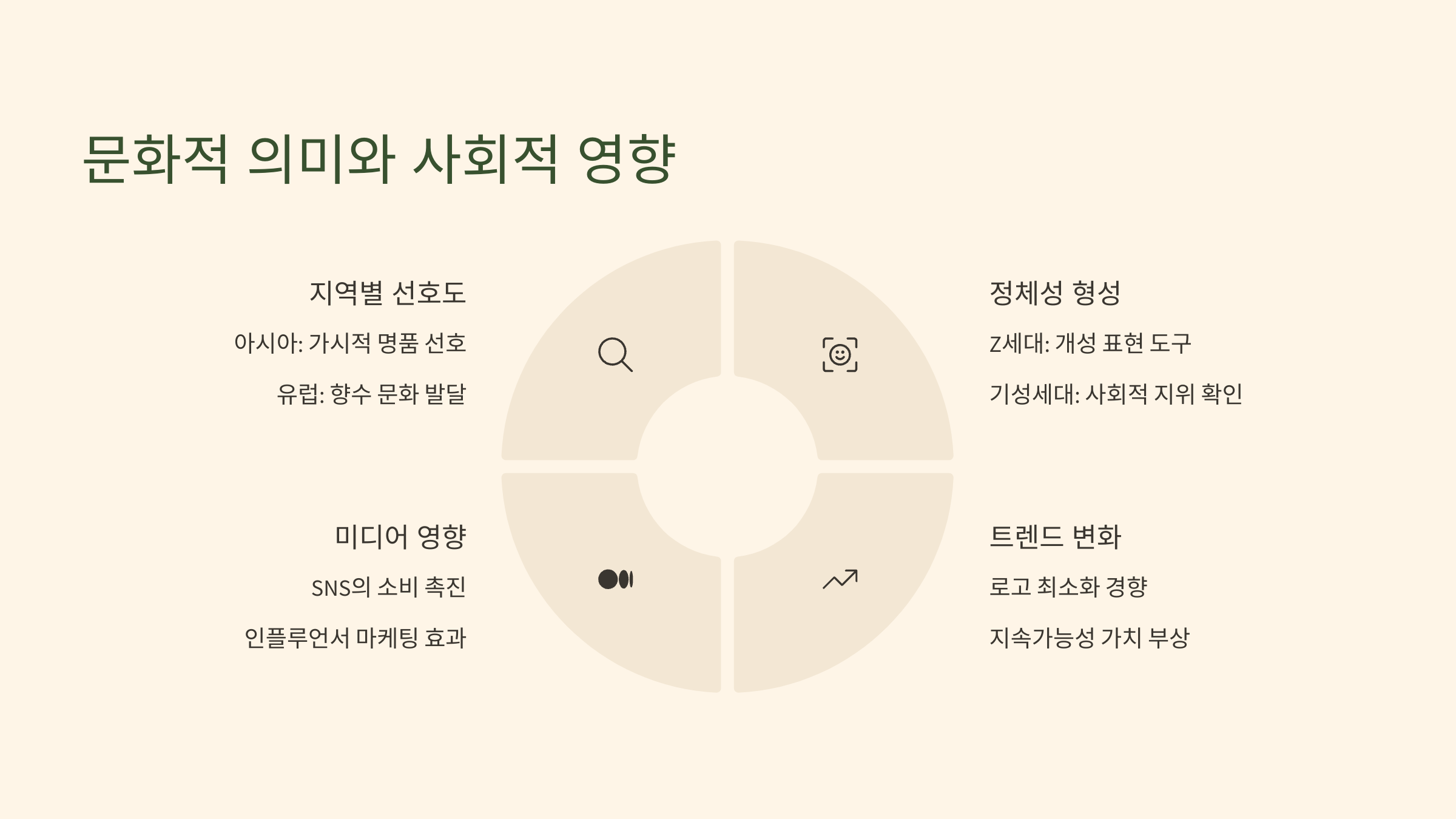 | 아시아 | 은은한 향 선호, 선물 문화 | 브랜드 로고 중시, 투자 개념 |
