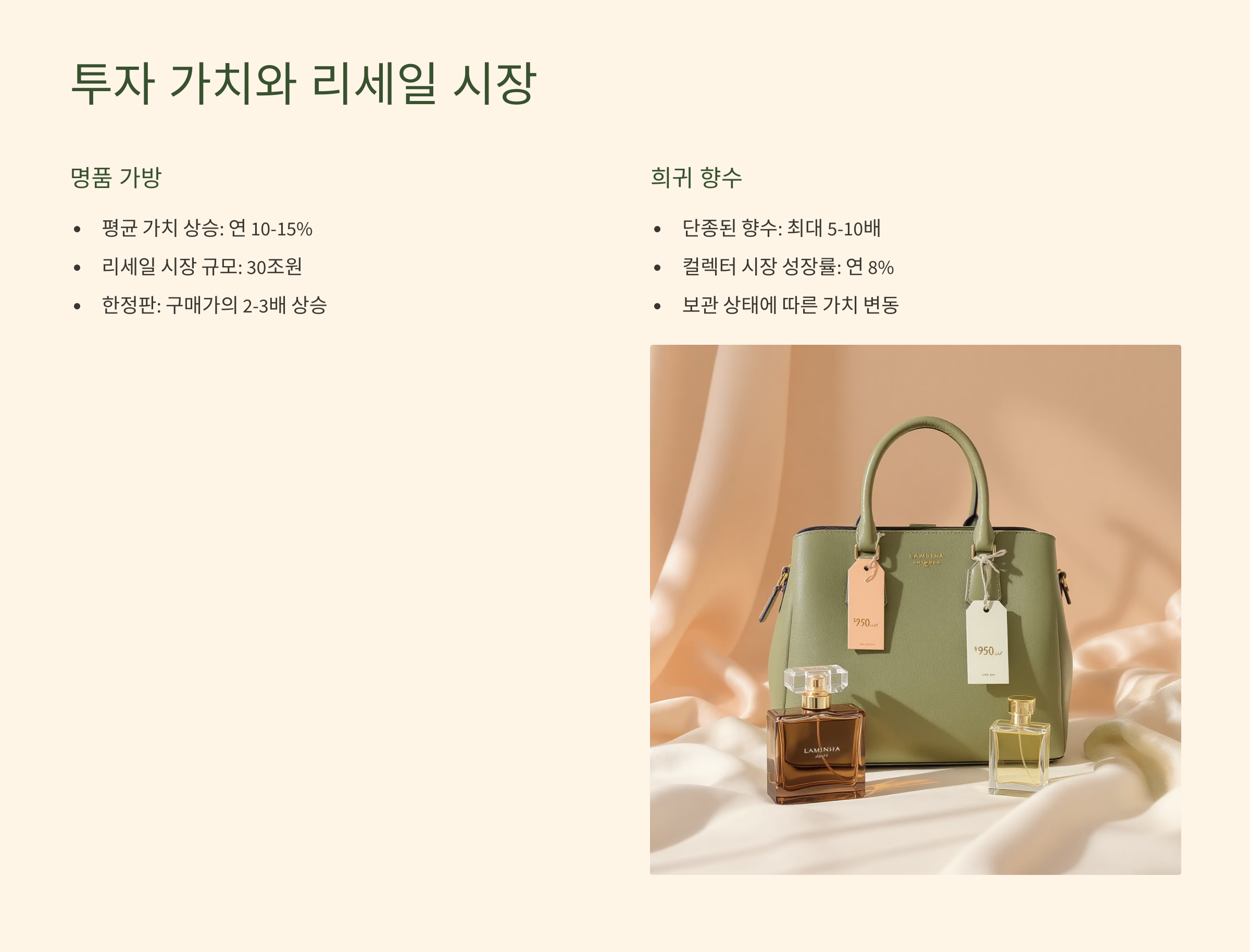 A8. 투자 관점에서는 명품이 훨씬 유리해요. 특히 에르메스, 샤넬, 롤렉스 같은 브랜드의 인기 모델은 구매가보다 높게 재판매되기도 해요. 향수는 소모품이라 투자 가치가 거의 없고, 빈티지 향수만 일부 수집 가치를 가져요. 하지만 투자 목적으로만 명품을 구매하는 것보다는, 실제로 사용하면서 가치를 유지하는 것이 더 현명한 선택이에요.