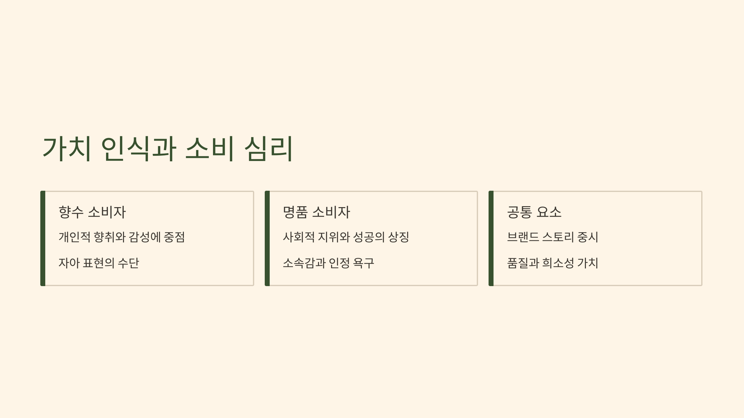 소비자 충성도 형성 과정도 다르게 나타나요. 향수 애호가들은 특정 향수에 대한 충성도는 높지만, 브랜드 충성도는 상대적으로 낮아요. 좋아하는 향을 찾으면 그 향수를 계속 구매하지만, 같은 브랜드의 다른 향수는 구매하지 않을 수 있어요. 명품은 브랜드 충성도가 매우 높게 형성돼요. 샤넬 마니아는 가방부터 신발, 액세서리까지 샤넬로 통일하는 경향이 있죠.