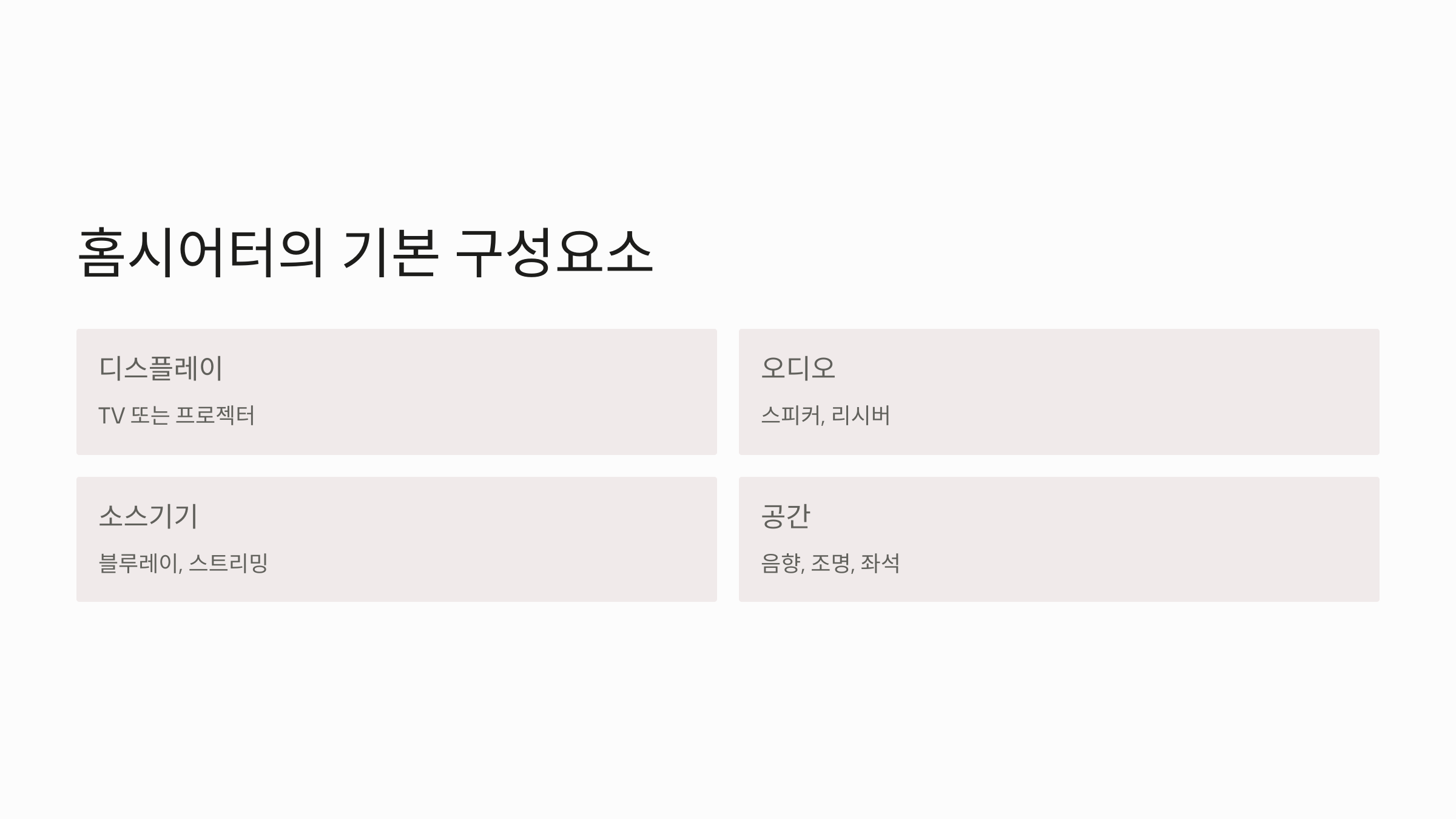 홈시어터를 구성하는 핵심 요소는 크게 디스플레이, 오디오 시스템, 재생 장치, 그리고 공간 세팅으로 나눌 수 있어요. 각각의 요소가 조화롭게 어우러져야 진정한 홈시어터의 감동을 느낄 수 있답니다. 먼저 디스플레이는 TV와 프로젝터 중에서 선택할 수 있는데, 공간의 크기와 예산, 사용 목적에 따라 결정하면 돼요. 최근에는 75인치 이상의 대형 TV도 많이 저렴해져서 접근성이 좋아졌어요.