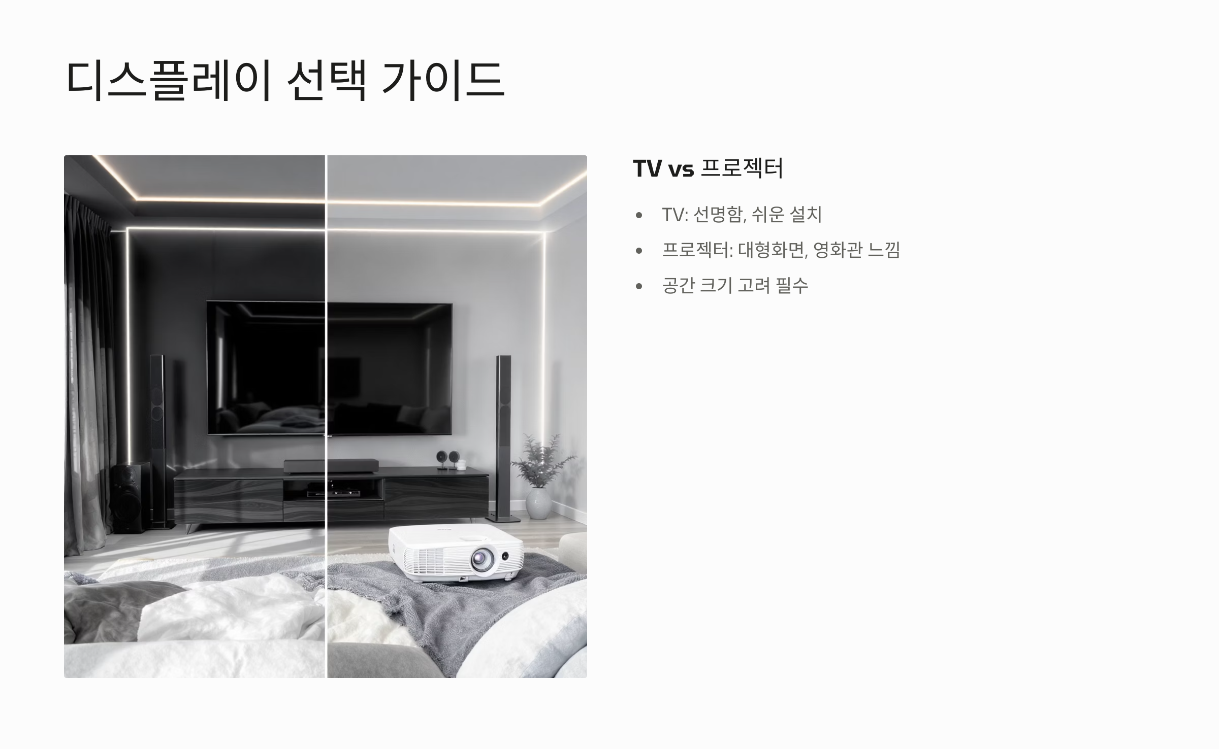 프로젝터를 선택한다면 단초점 프로젝터가 공간 활용에 유리해요. 벽에서 20~30cm만 떨어뜨려도 100인치 화면을 만들 수 있거든요. 최근에는 4K 해상도에 HDR을 지원하는 프로젝터도 많이 출시되어 화질 면에서도 TV에 뒤지지 않아요. 엡손의 LS12000이나 소니의 VPL-VW295 ES 같은 모델들은 영화 마니아들 사이에서 인기가 높답니다. 다만 프로젝터는 램프 수명이 있어서 주기적인 교체가 필요하고, 완전한 암막이 되어야 최상의 화질을 즐길 수 있다는 점을 고려해야 해요.