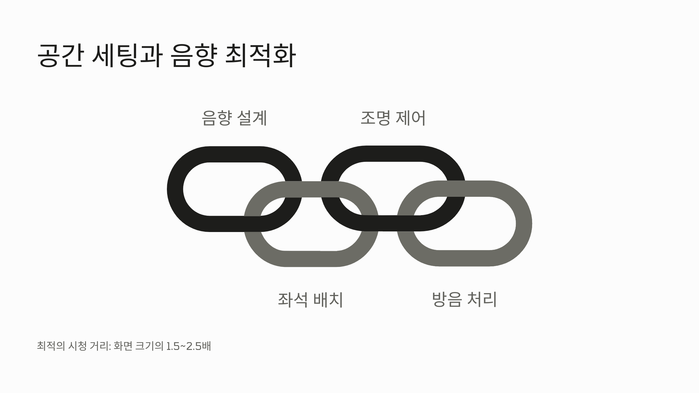아무리 좋은 장비를 갖춰도 공간 세팅이 제대로 되지 않으면 성능을 100% 발휘할 수 없어요. 홈시어터 공간의 이상적인 비율은 가로:세로:높이가 1.6:1:0.6 정도인데, 이는 음향학적으로 정재파가 가장 적게 발생하는 비율이에요. 물론 대부분의 가정에서는 이상적인 비율을 맞추기 어렵지만, 최대한 정사각형이나 정육면체 공간은 피하는 것이 좋답니다. 천장이 높을수록 음향적으로 유리하고, 특히 돌비 애트모스 시스템을 구축할 때는 천장 높이가 중요해요.
