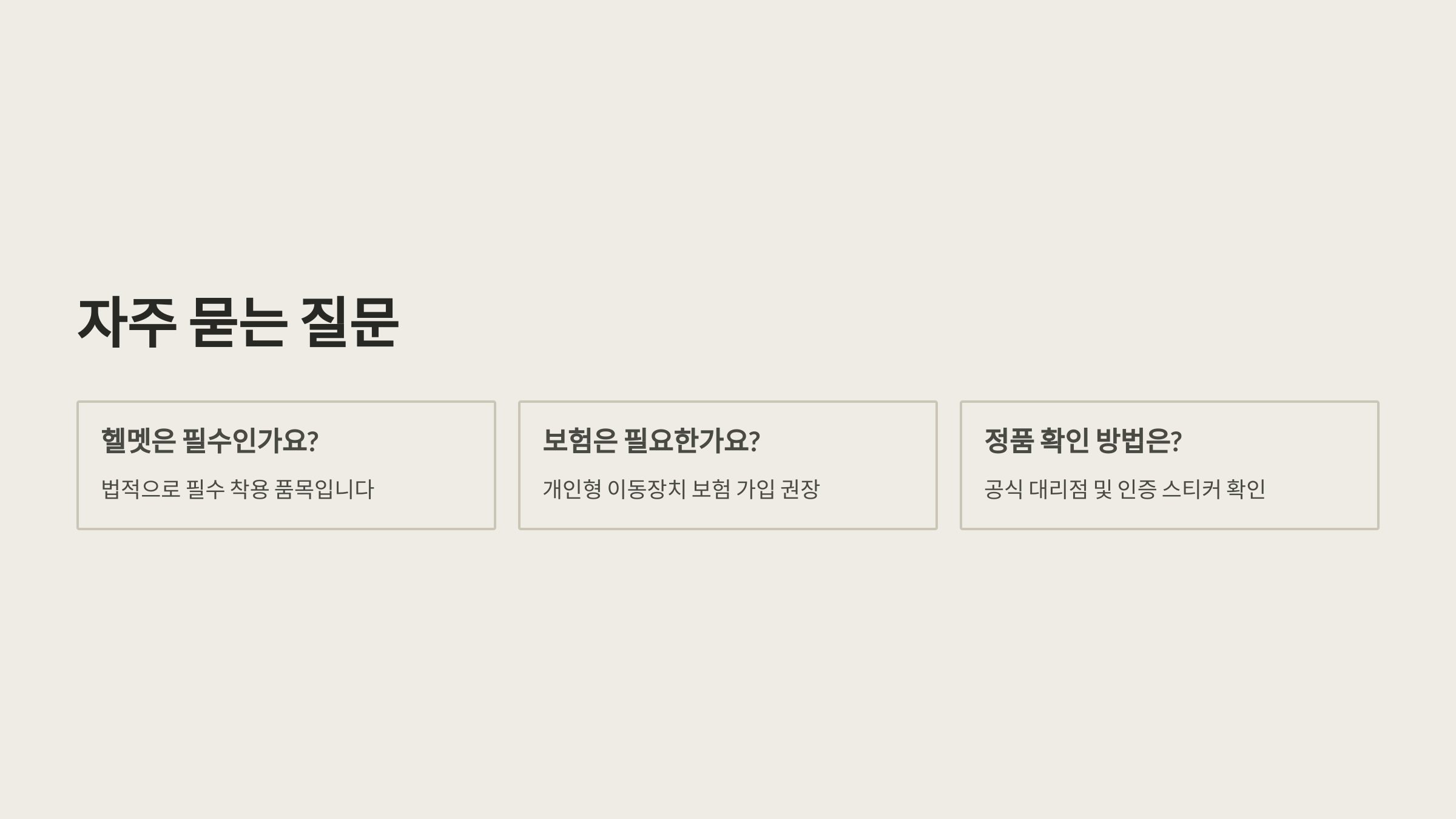 A7. 법적으로 의무예요! 헬멧 미착용 시 2만 원의 범칙금이 부과되며, 더 중요한 건 안전이에요. 시속 25km/h로 달리다 넘어지면 심각한 부상을 입을 수 있어요. 자전거용 헬멧도 가능하지만, KC 인증을 받은 제품을 선택하세요. 턱끈도 꼭 채워야 제대로 된 보호를 받을 수 있답니다.
