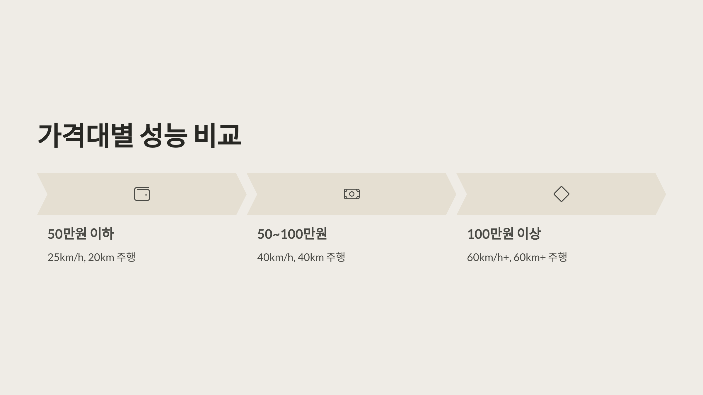 50-100만 원대는 중급 사용자를 위한 가격대예요. 500-1000W 모터와 13-20Ah 배터리로 더 강력한 성능을 제공하며, 주행거리도 40-60km로 늘어나요. 전후륜 서스펜션, 듀얼 브레이크 시스템 등 안전과 편의 기능도 향상되고, 나인봇 맥스 시리즈나 미니모터스 스피드웨이 시리즈가 인기가 많아요.