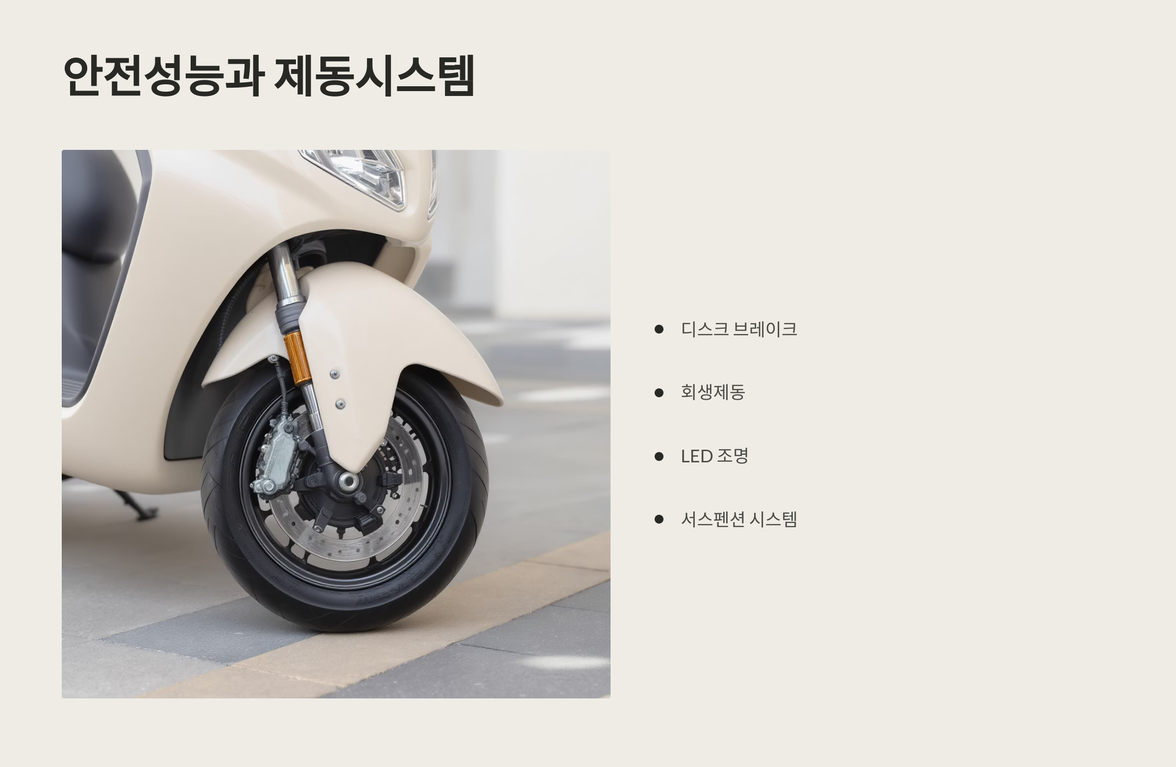 ABS(Anti-lock Braking System)를 탑재한 모델도 늘어나고 있어요. 급제동 시 바퀴가 잠기는 것을 방지해서 미끄러짐을 줄이고 제동거리를 단축시켜요. 특히 젖은 노면이나 자갈길에서 효과적이며, 고급 모델에서는 전륜과 후륜에 각각 ABS를 적용하기도 해요.