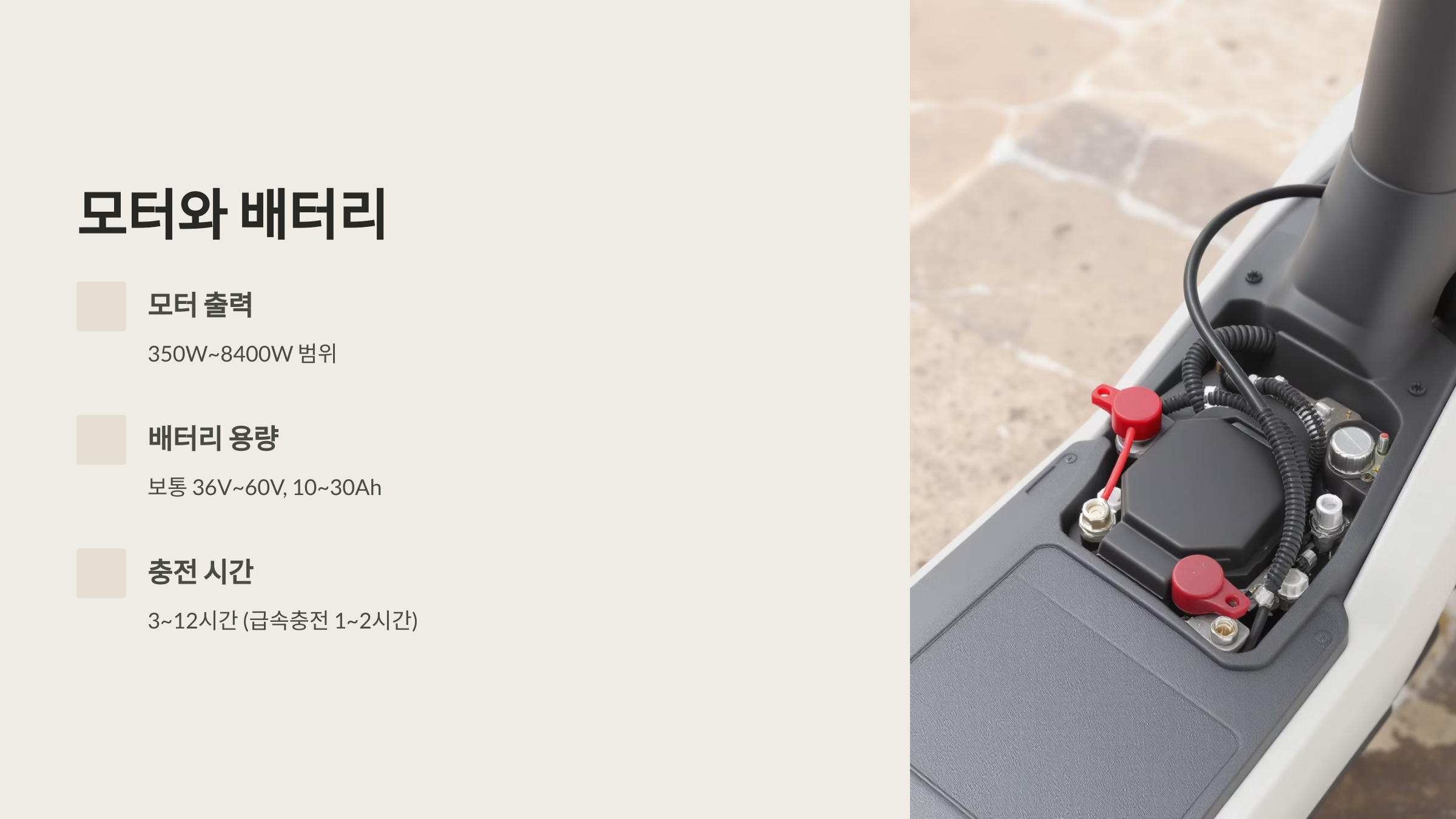 모터의 종류도 성능에 영향을 미쳐요. BLDC(Brushless DC) 모터가 가장 널리 사용되는데, 효율이 높고 수명이 길며 유지보수가 거의 필요 없어요. 일부 고급 모델은 사인파 컨트롤러를 사용해서 더 부드러운 가속과 조용한 작동을 구현하기도 해요.