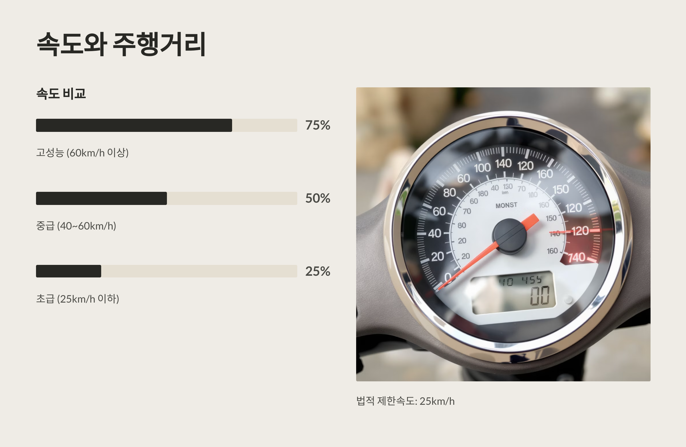 전동킥보드의 속도와 주행거리는 서로 상충하는 관계에 있어요. 빠른 속도로 주행할수록 배터리 소모가 커져서 주행거리가 줄어들게 되죠. 제조사에서 제공하는 주행거리는 보통 평지에서 일정한 속도로 주행했을 때의 이상적인 수치라는 점을 알아두세요.