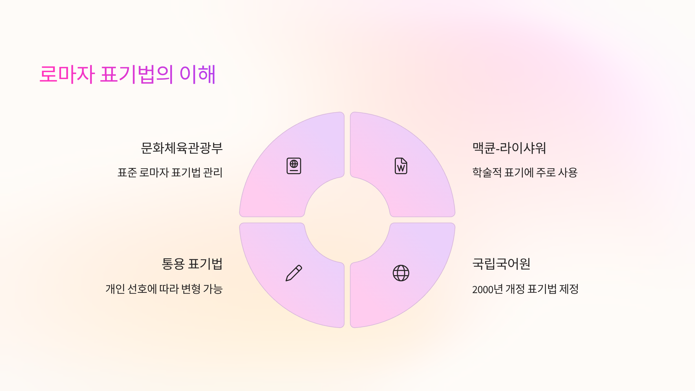 로마자 표기법은 한글을 로마자(알파벳)로 전환하는 공식적인 규칙이에요. 현재 사용되는 '국어의 로마자 표기법'은 2000년 7월 7일에 고시되었어요. 이전에 사용하던 매큔-라이샤워 표기법을 대체한 것으로, 한글의 형태를 중시하면서도 발음을 고려한 절충안이라고 할 수 있죠.