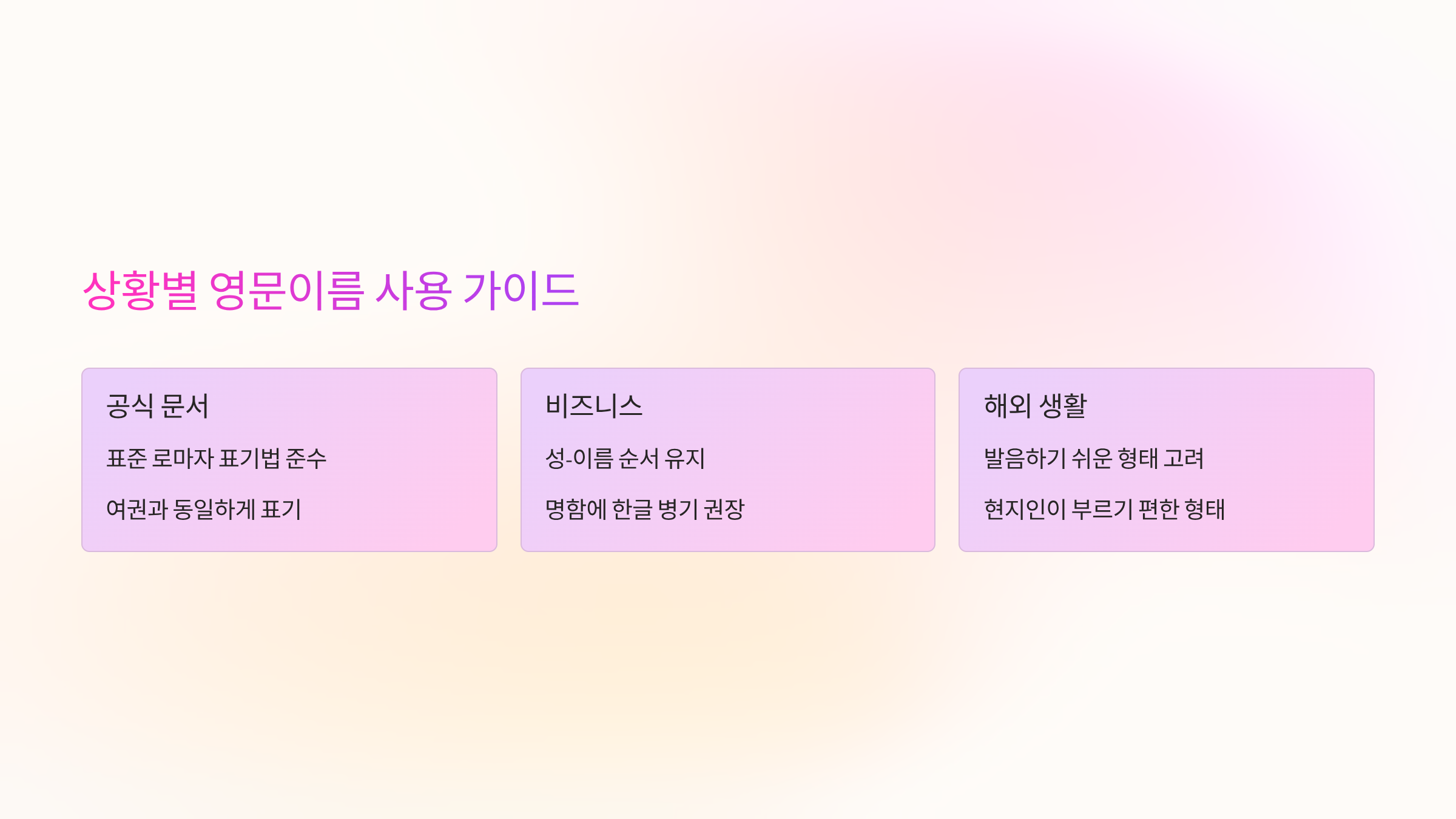 법적 효력을 고려한 작성도 필요해요. 계약서, 공증 서류, 법원 문서 등에서는 반드시 여권과 동일한 영문이름을 사용해야 해요. 조금이라도 다르면 추가 확인 절차가 필요하고, 심한 경우 문서의 효력이 인정되지 않을 수도 있어요. 중요한 문서일수록 정확성이 중요해요.