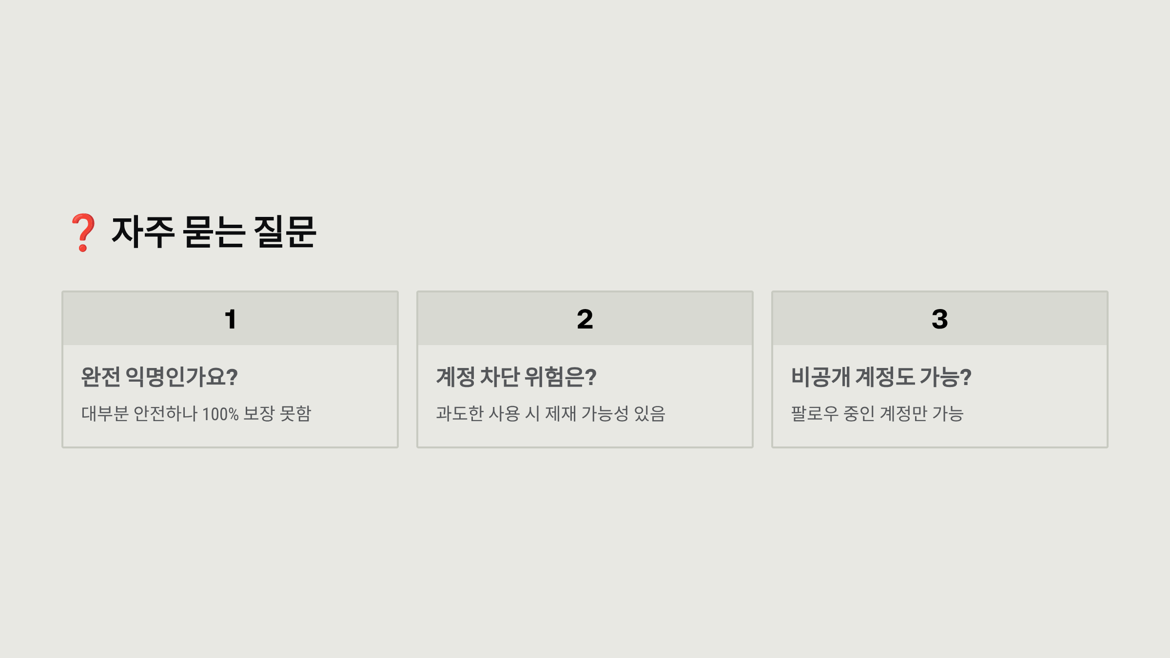 A6. 과도하게 사용하거나 자동화 도구를 사용하면 계정 정지 위험이 있어요. 하지만 개인적으로 가끔 사용하는 정도로는 문제가 되지 않는 경우가 대부분이에요.