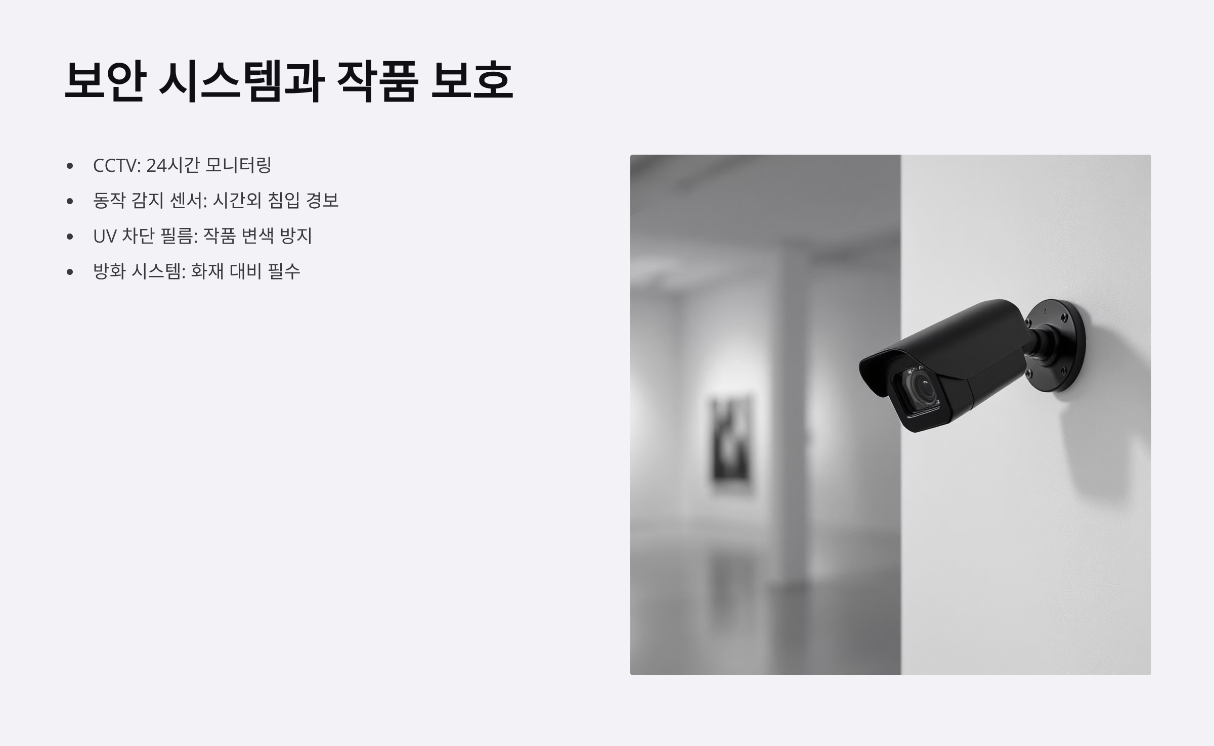 작품 고정 장치와 보호 설비도 중요해요. 그림은 도난 방지 행거를 사용하고, 조각품은 바닥이나 좌대에 고정해야 해요. 진열장은 강화유리와 특수 잠금장치를 사용하고, UV 차단 필름을 부착해 작품 손상을 방지해야 해요. 작품과 관람객 사이에 적절한 거리를 유지하기 위한 로프나 스탠션 설치도 필요해요.