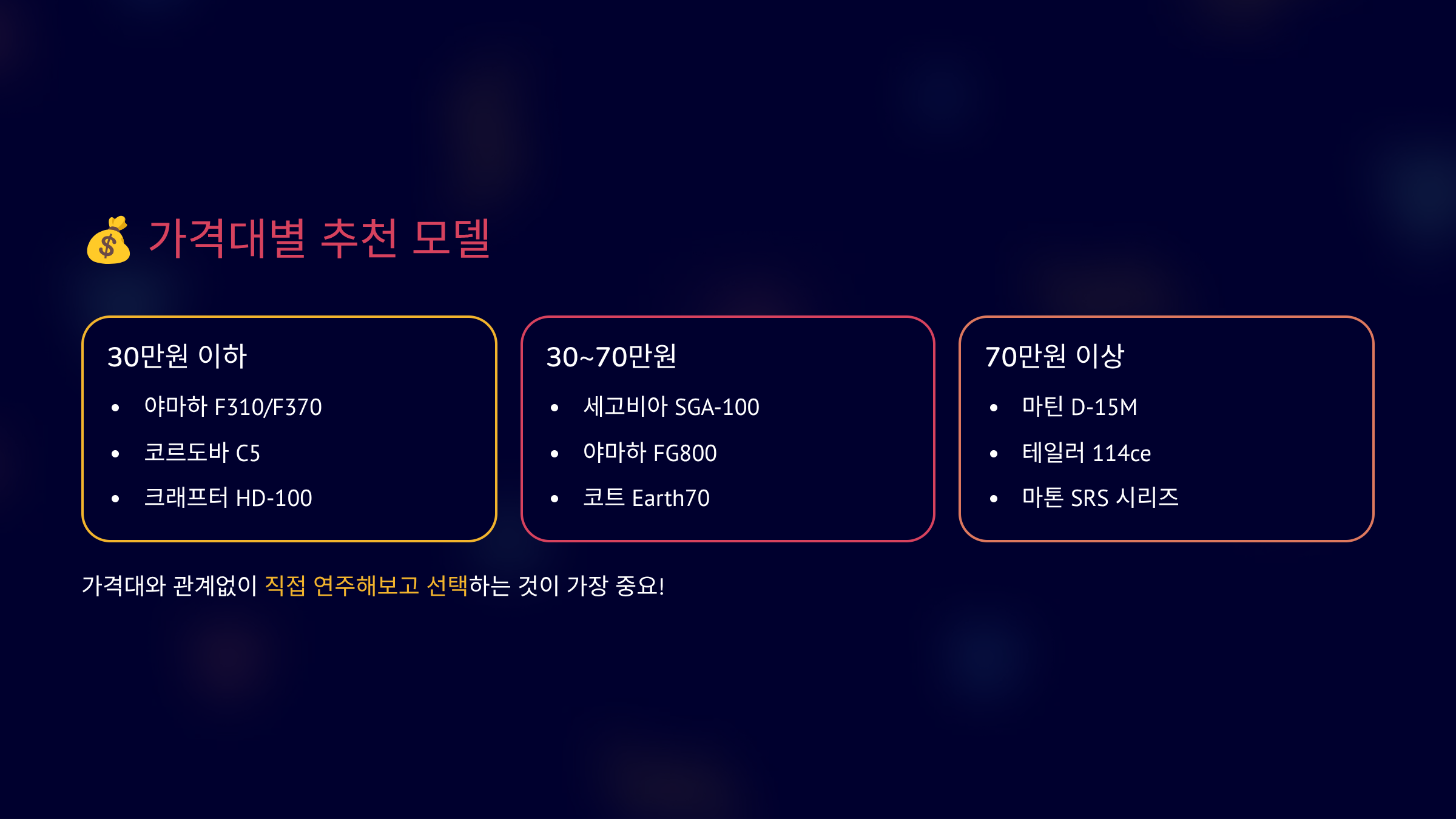 | 30만원 이하 | 야마하 FG830 | 솔리드 상판, 입문 최적 |