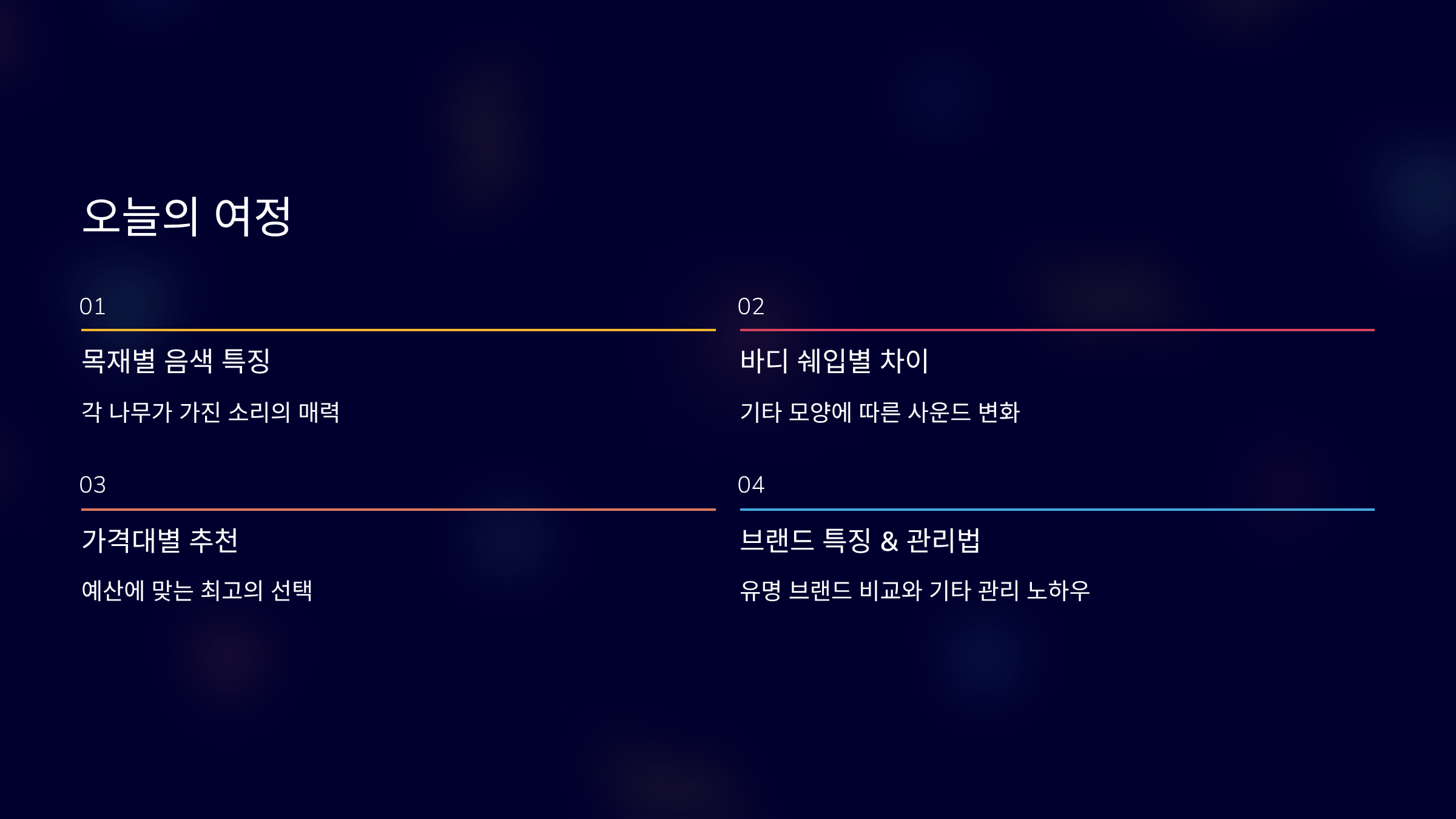 | 시더/마호가니 | 따뜻하고 부드러움 | 발라드, 포크 |