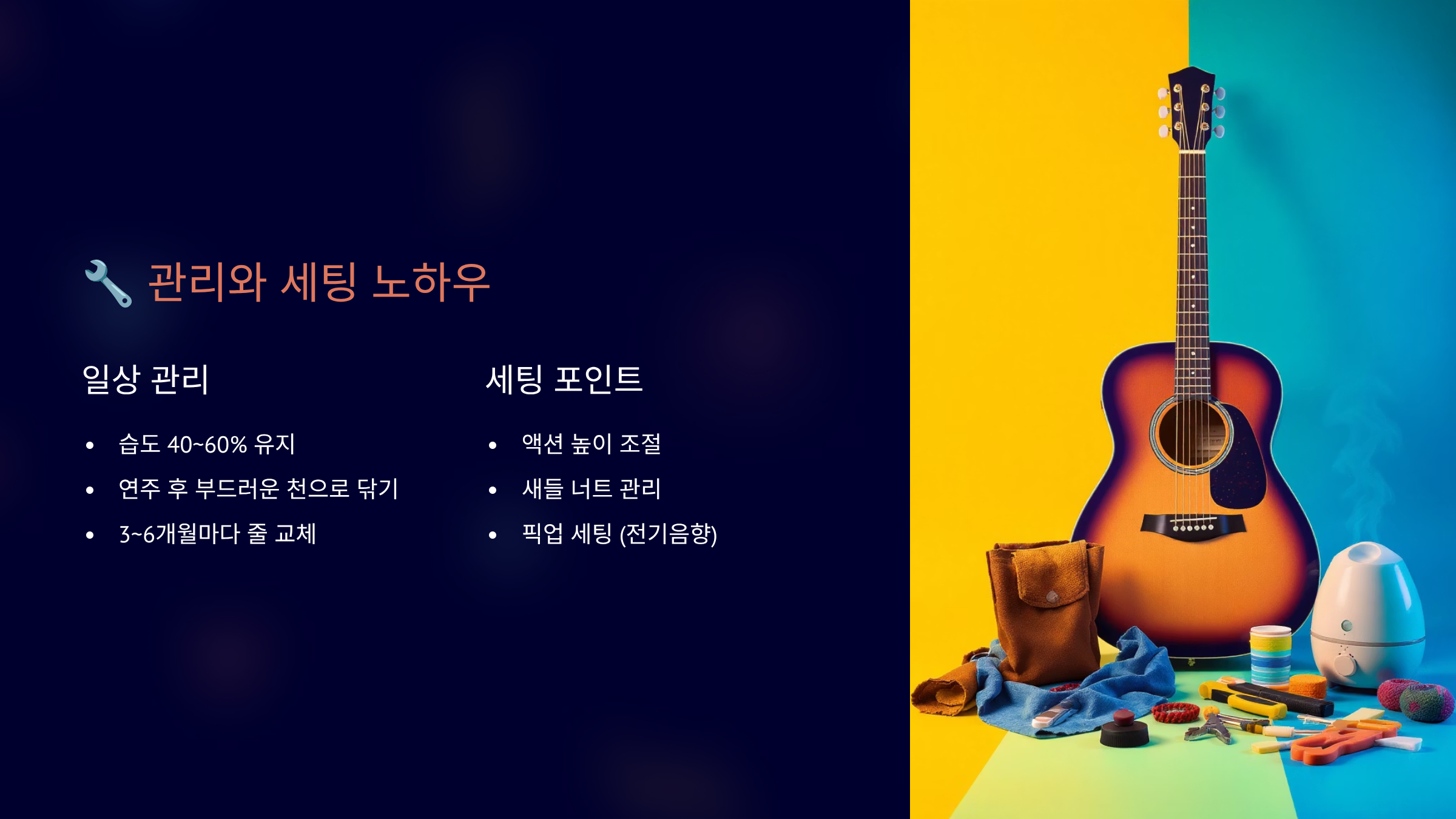 기타 관리의 첫걸음은 적절한 습도 유지예요. 이상적인 습도는 45-55%이며, 특히 겨울철 건조함은 기타의 최대 적이에요. 휴미디파이어를 사운드홀에 넣어두면 크랙을 예방할 수 있어요. 댐핏, 오아시스, 플래닛웨이브 같은 제품들이 인기 있어요. 케이스 안에 습도계를 두고 수시로 체크하는 습관이 중요해요.