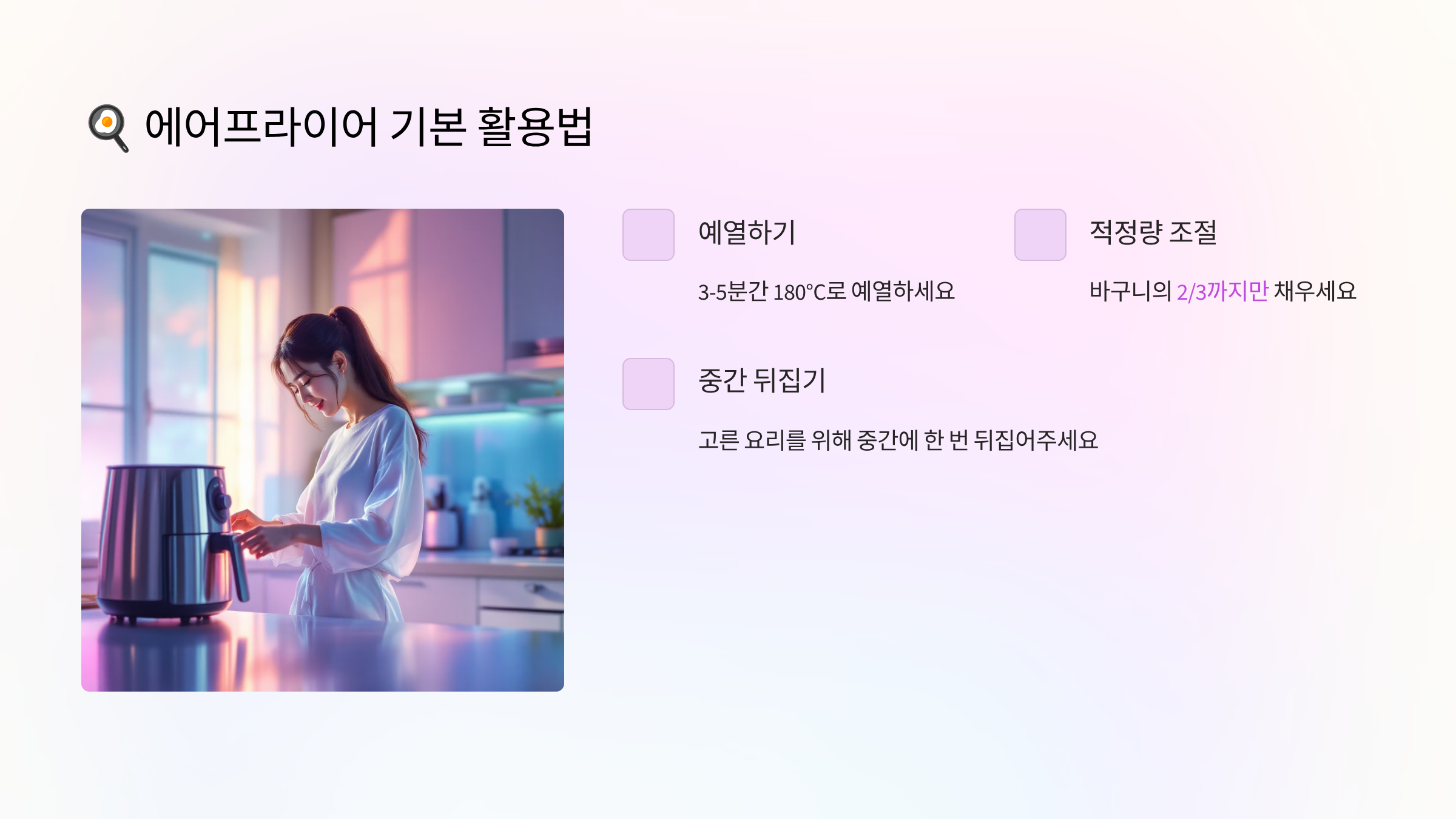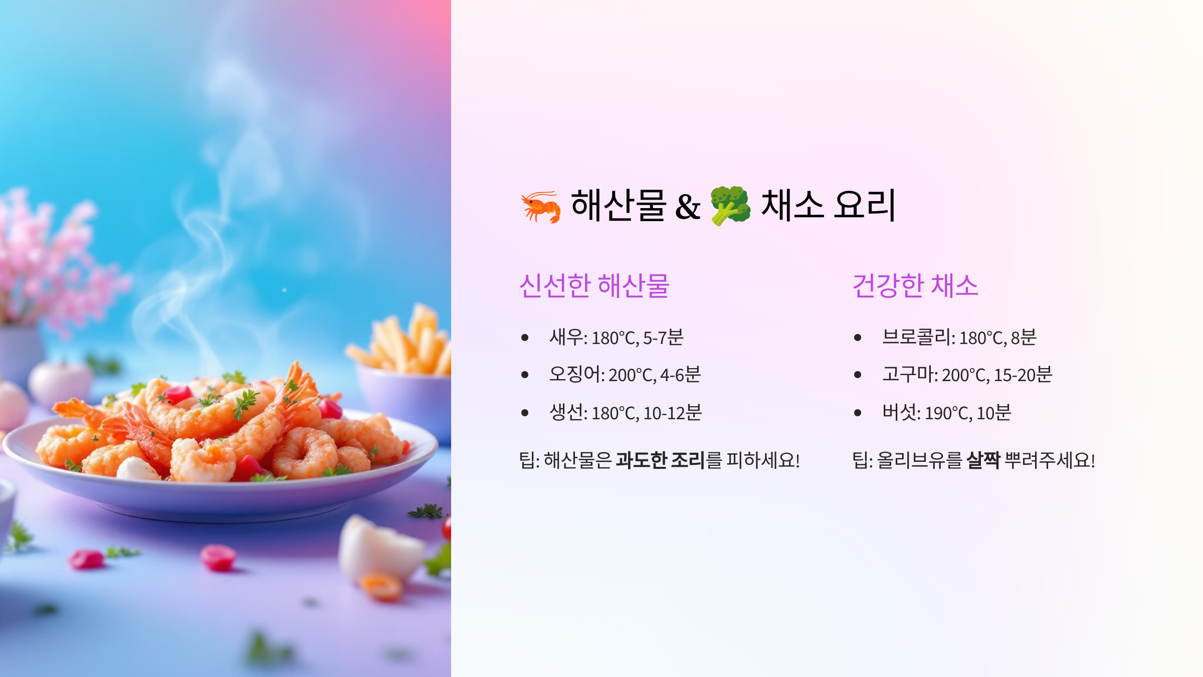면책조항: 본 콘텐츠는 일반적인 정보 제공을 목적으로 작성되었으며, 개인의 상황에 따라 결과가 다를 수 있습니다. 조리 시간과 온도는 에어프라이어 기종과 식재료 상태에 따라 조절이 필요할 수 있으며, 식품 안전 수칙을 준수하시기 바랍니다.