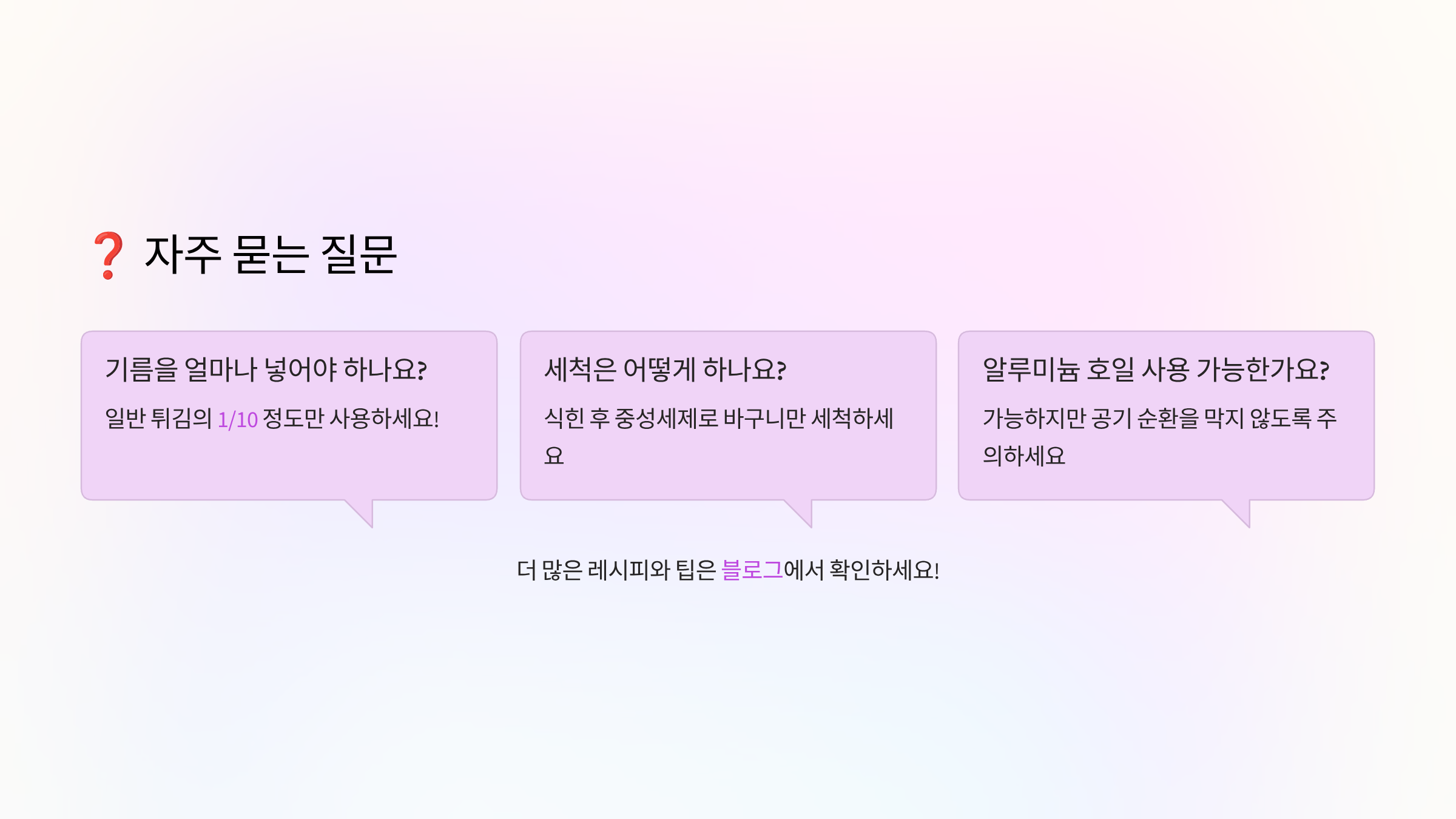 A8. 매 사용 후 깨끗이 청소하고, 연마제가 든 세제는 피하세요. 바스켓 코팅이 벗겨지지 않도록 부드러운 스펀지를 사용하고, 한 달에 한 번은 깊은 청소를 해주세요. 과부하를 피하고 적정 용량만 조리하는 것도 중요해요.