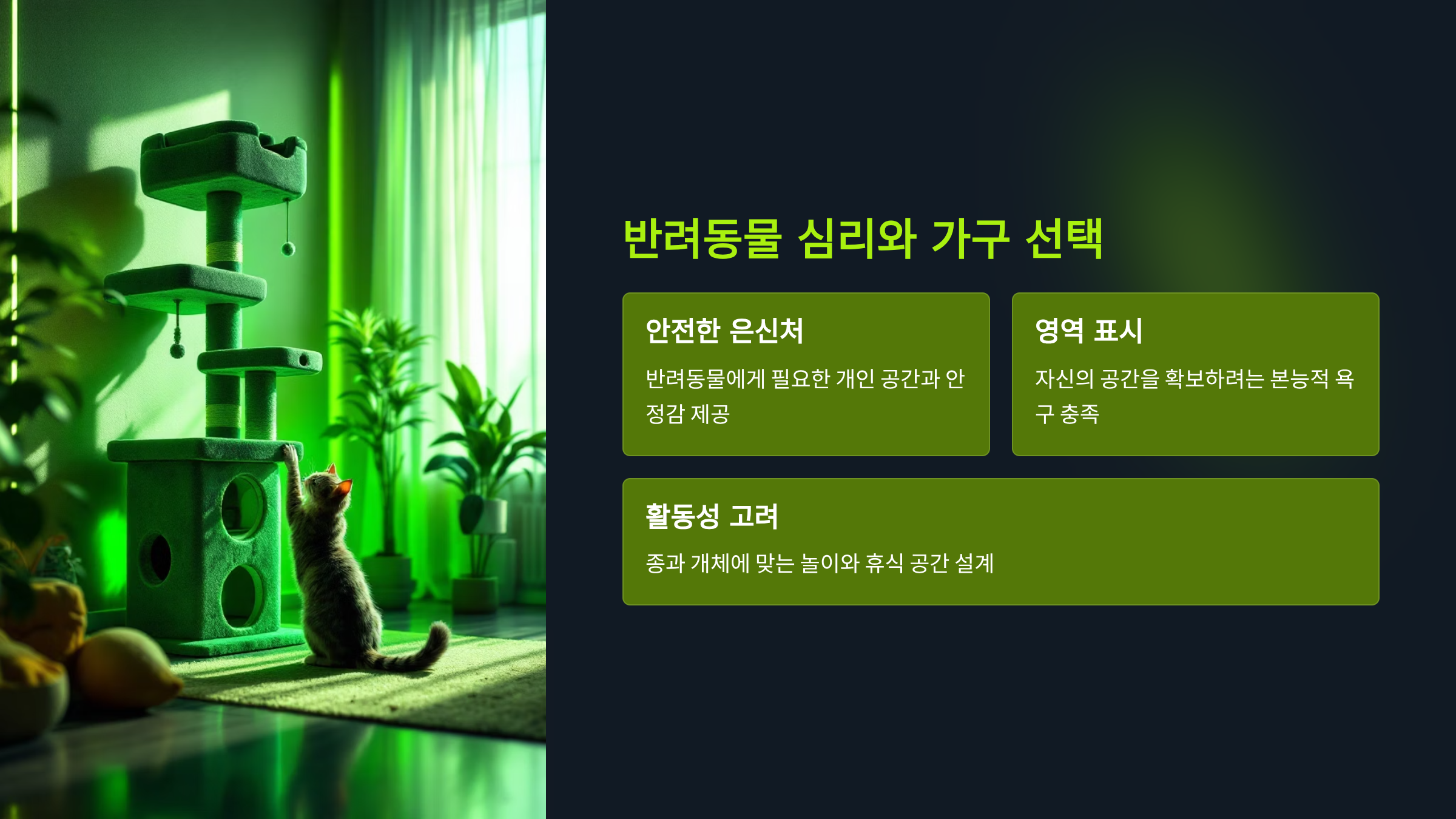 | 소심한 성격 | 은신처 많은 캣타워, 동굴형 하우스 | 오픈형 가구, 투명 하우스 |