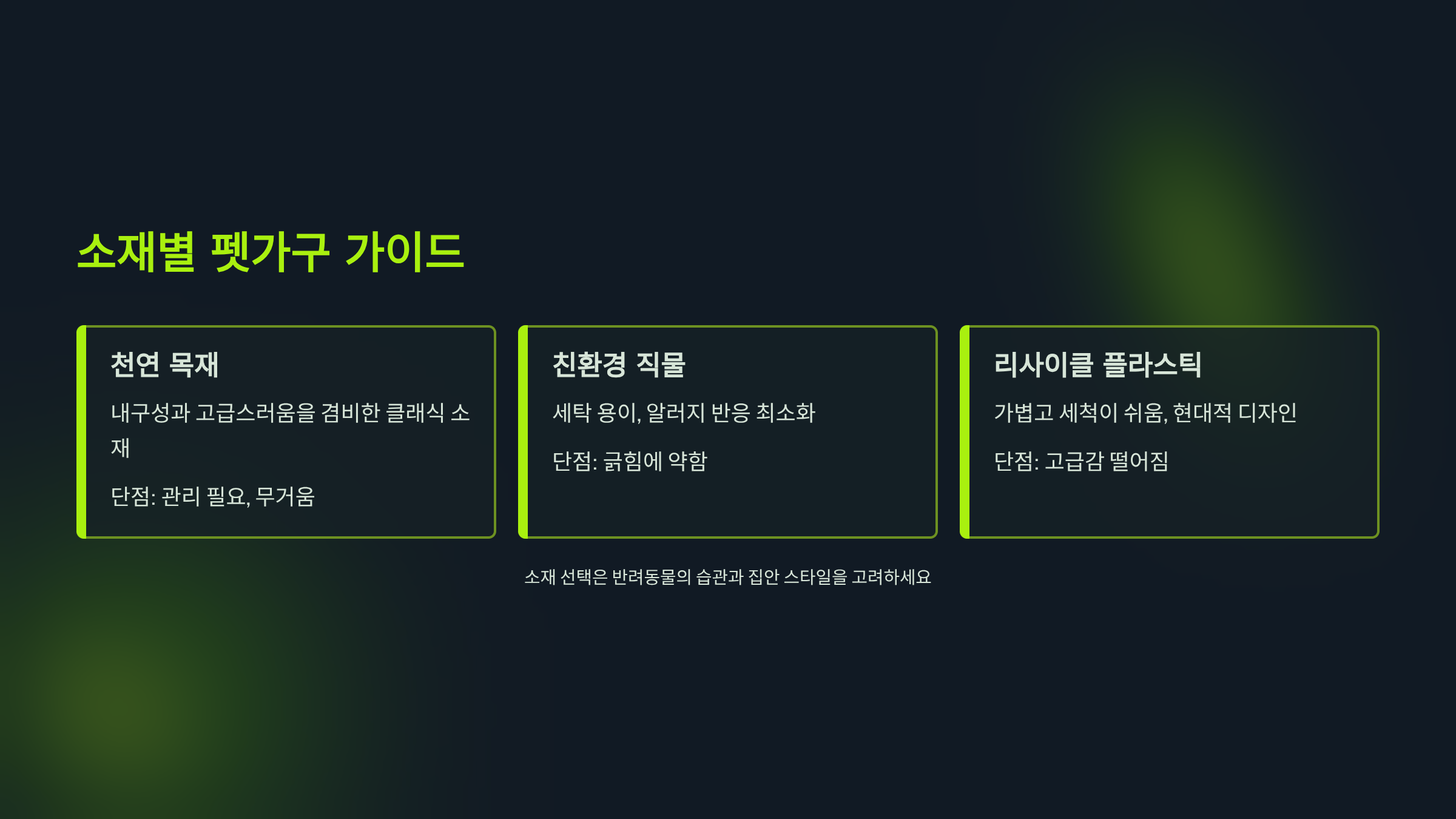 펫가구의 소재 선택은 반려동물의 건강과 직결되는 중요한 문제예요. 🌳 각 소재마다 장단점이 있고, 반려동물의 특성에 따라 적합한 소재가 달라요. 원목, 합판, 플라스틱, 패브릭, 메탈 등 다양한 소재가 사용되는데, 각각의 특징을 잘 알고 선택해야 해요.