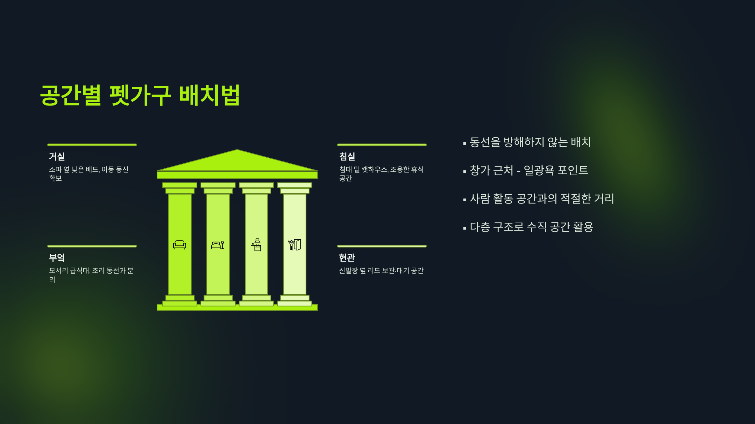 펫가구 배치는 단순히 빈 공간에 놓는 것이 아니라 반려동물의 동선과 생활 패턴을 고려해야 해요. 🏡 집의 구조와 크기, 반려동물의 습성에 따라 최적의 배치가 달라진답니다. 전문가들은 반려동물이 하루 중 가장 많은 시간을 보내는 장소를 먼저 파악하라고 조언해요.